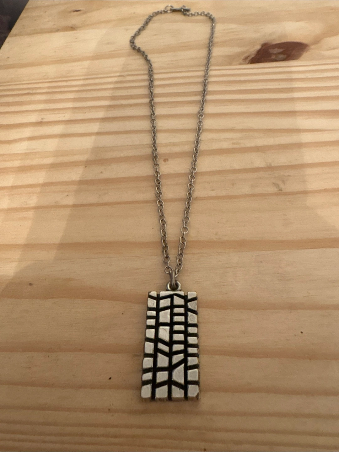 It features a chain and a pendant. It features a rectangular design. A wonderful piece for a quiet evening.