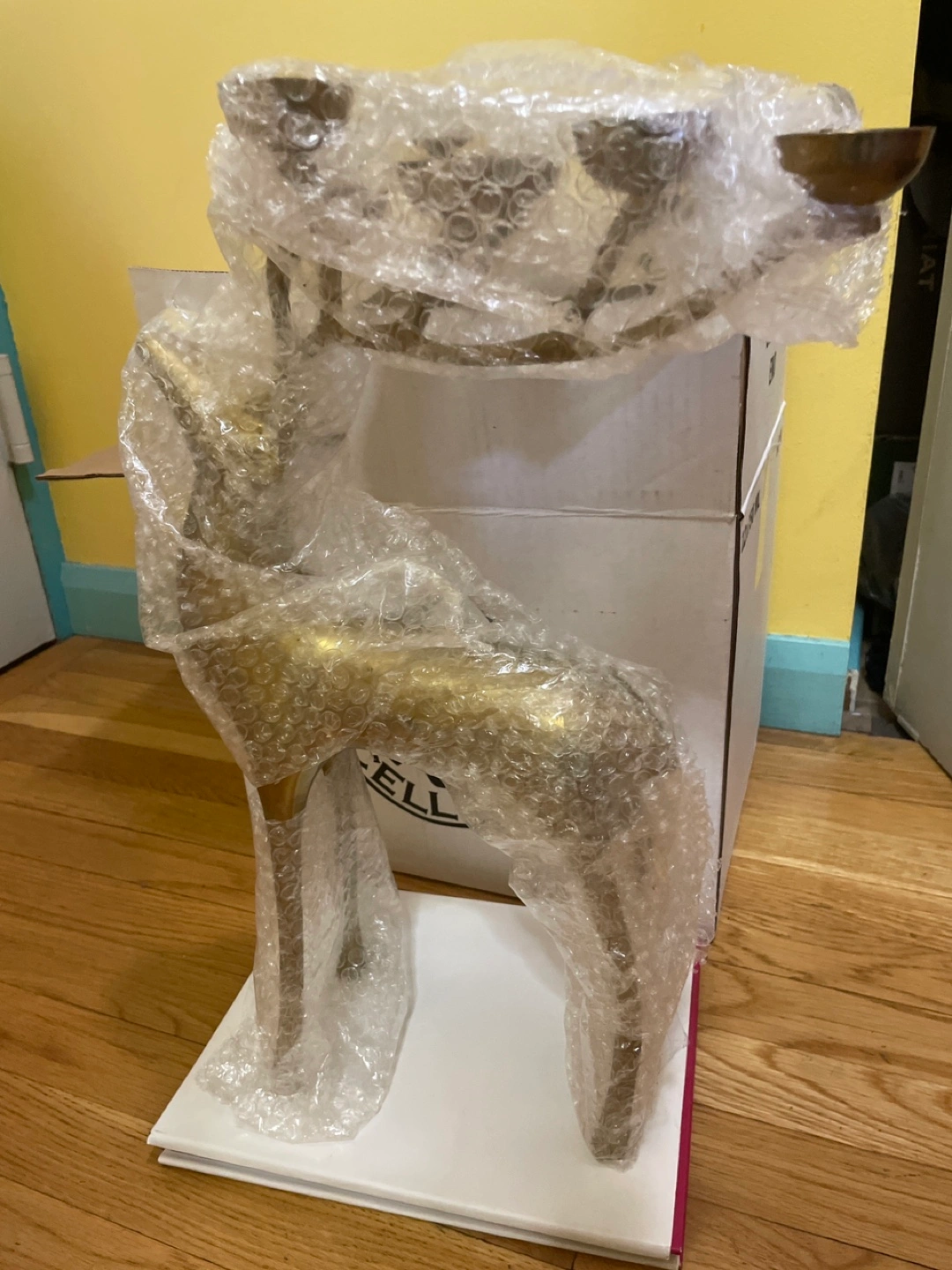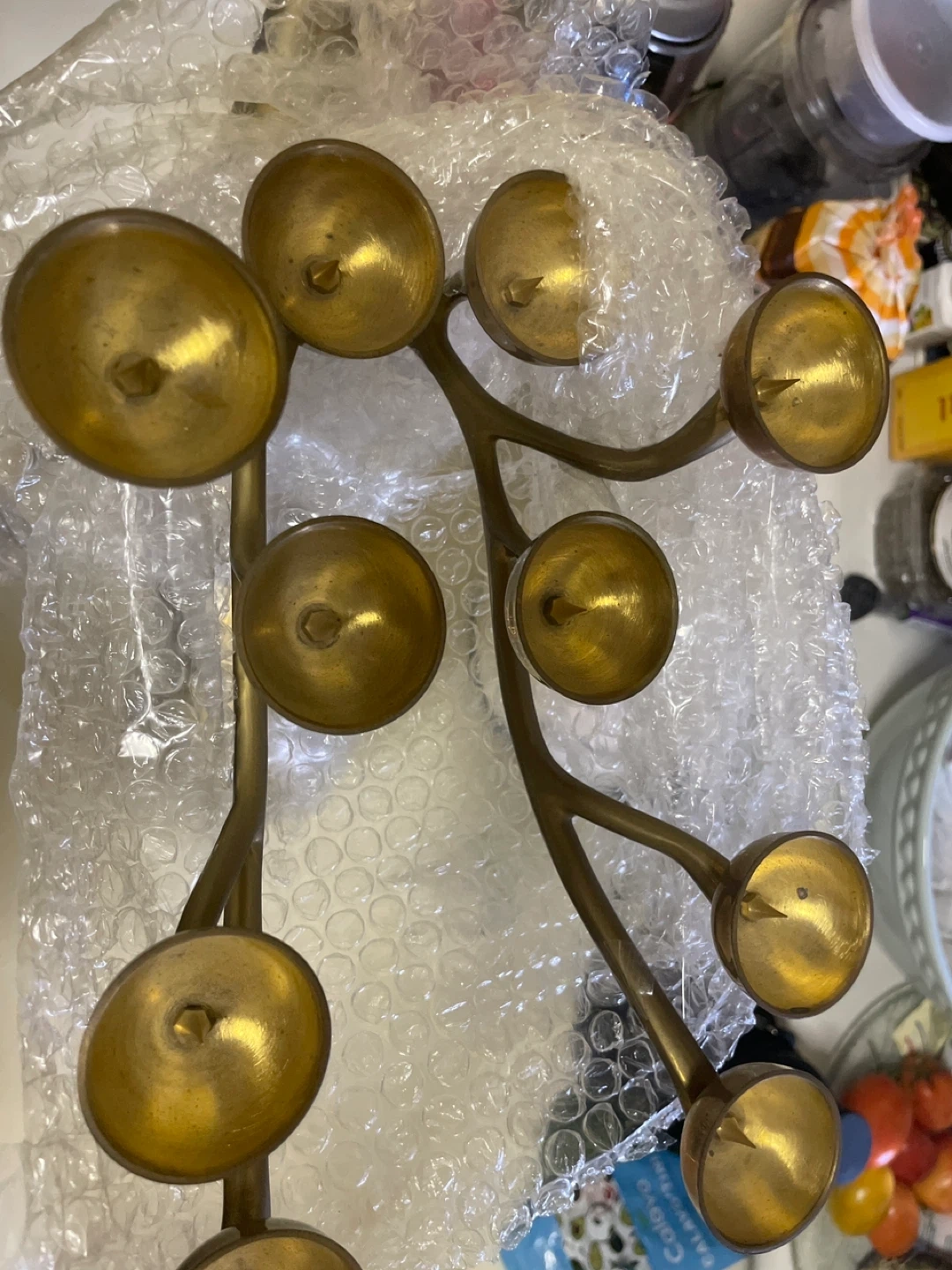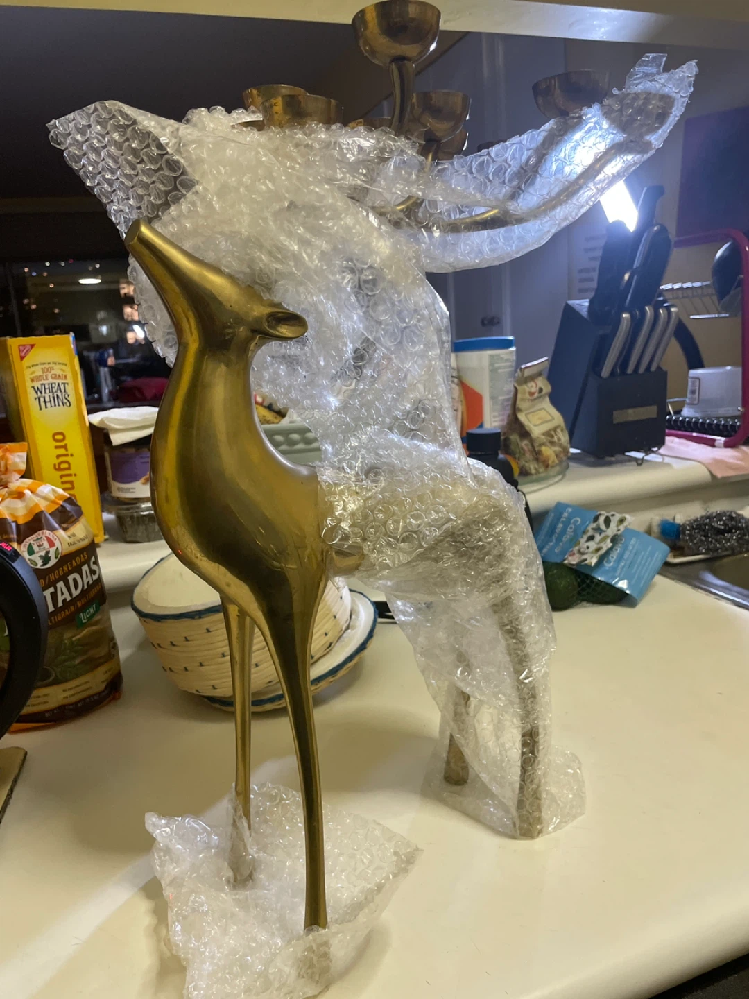 Antique deer-shaped candlestick holder. Made of brass. Some of the candlesticks are 8 shaped like cups. I bet this would look great as a centerpiece any place at home.