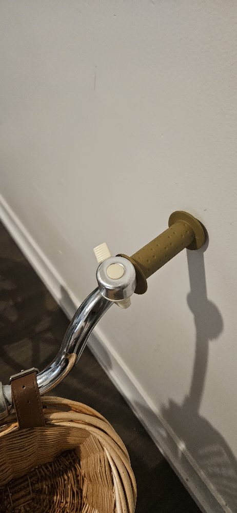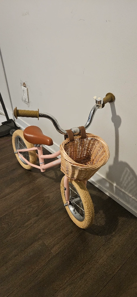 The balance bike offers a comfortable brown saddle. Comes with a natural wicker basket in the front. The wheels are a creamy colour and tires have tread. This could be a great way to enjoy a relaxing ride in the park.