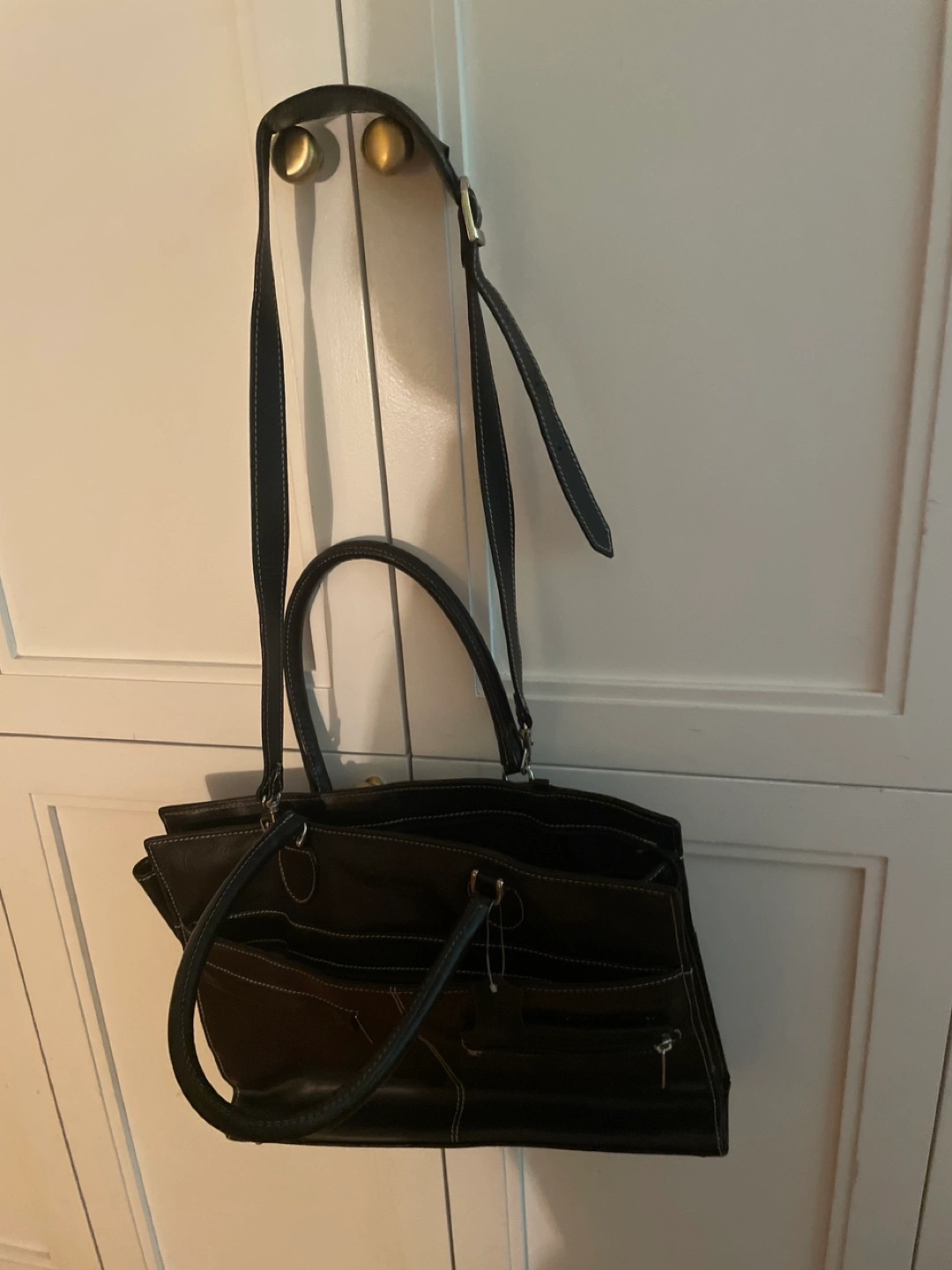 Black leather bag with white stitching. Features a top handle and a shoulder strap. Zippers on the front. A great bag for carrying your essentials around the city or anywhere you go.