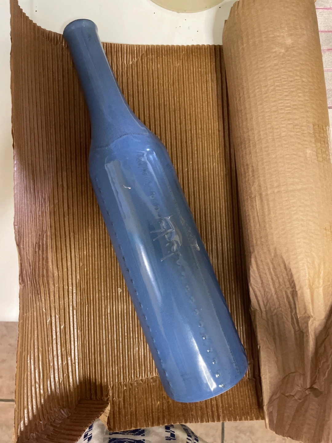 Here are some ceramic bottles, one blue and one yellow. Both are wrapped in paper, resting on corrugated cardboard. Consider using them to add a touch of color to your home decor. 2 bottles for 15