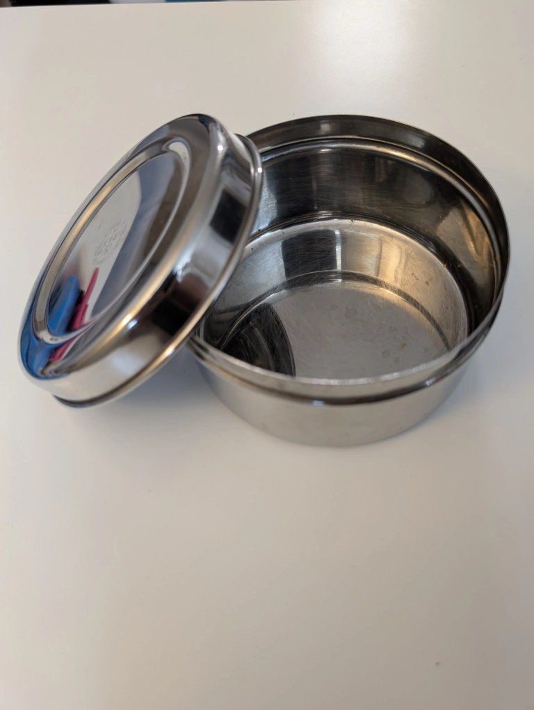 A round stainless steel container with a matching lid. Features a shiny, reflective surface. The lid fits snugly onto the container. This container is perfect for storing your snacks and keeping them fresh for when you need them.