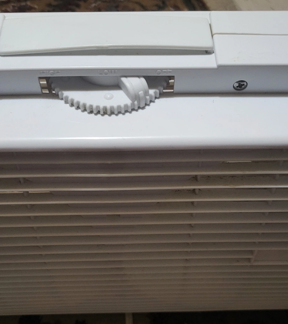 White window fan with three settings. Features two oval fan openings with white horizontal bars. Perfect for creating a cool and relaxing environment.