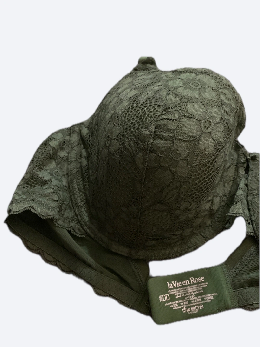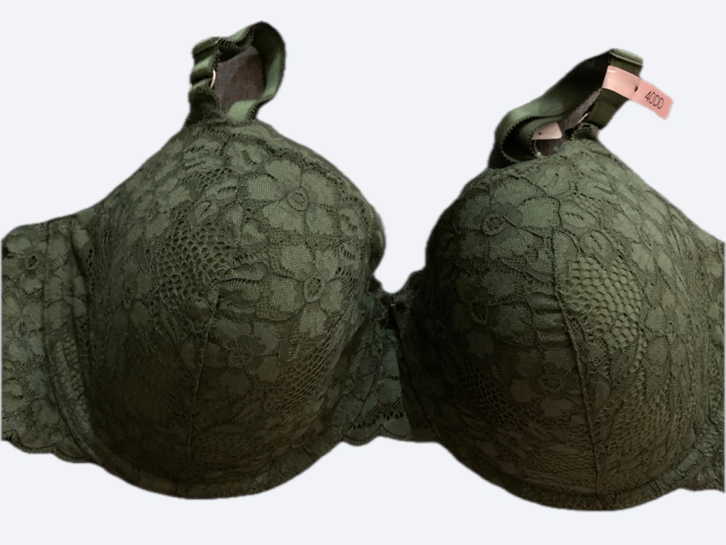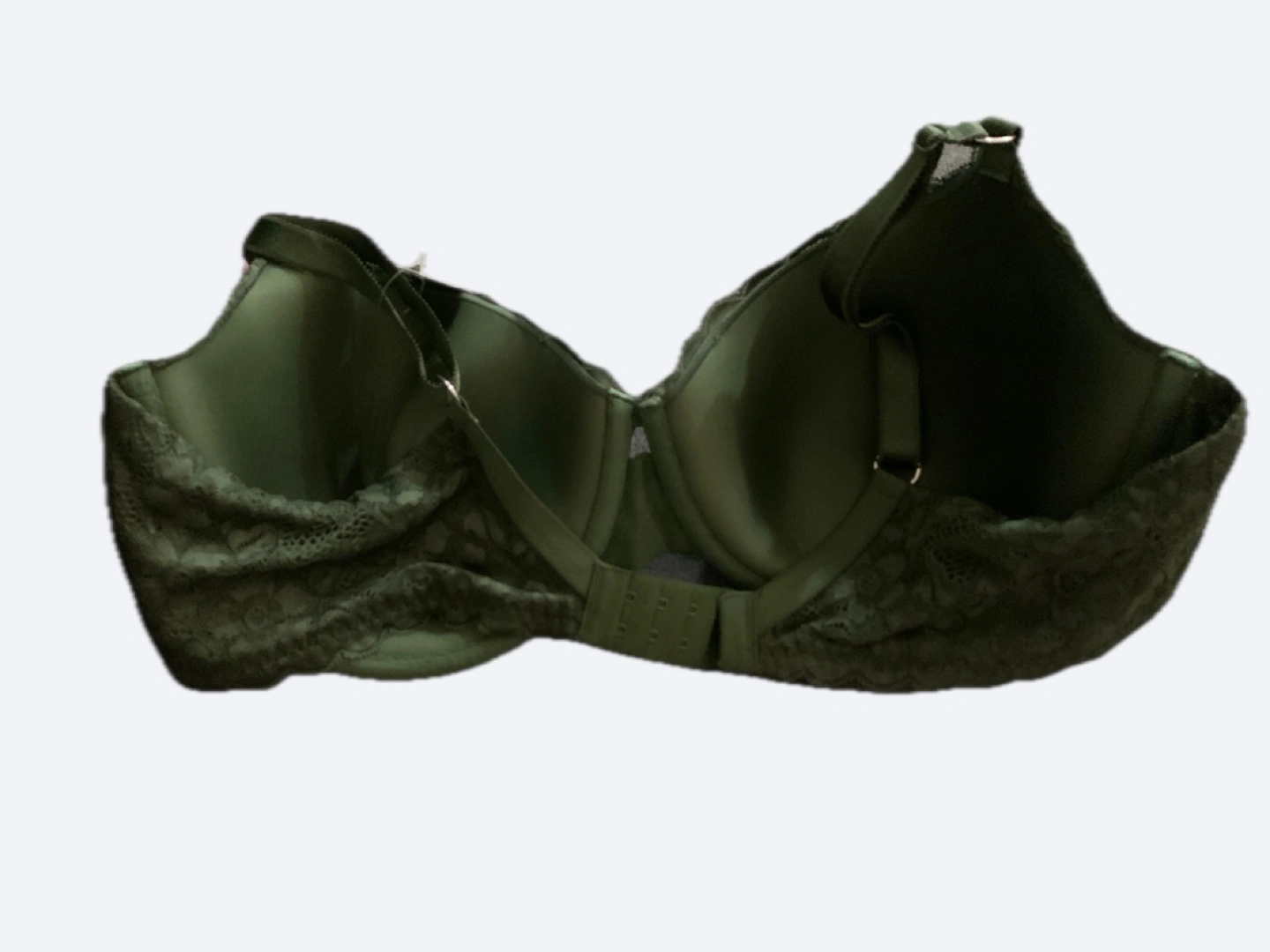 A beautiful green lace bra. The bra has underwire, adjustable straps, and a hook and eye closure. Wearing this bra can help you feel comforted all day long.