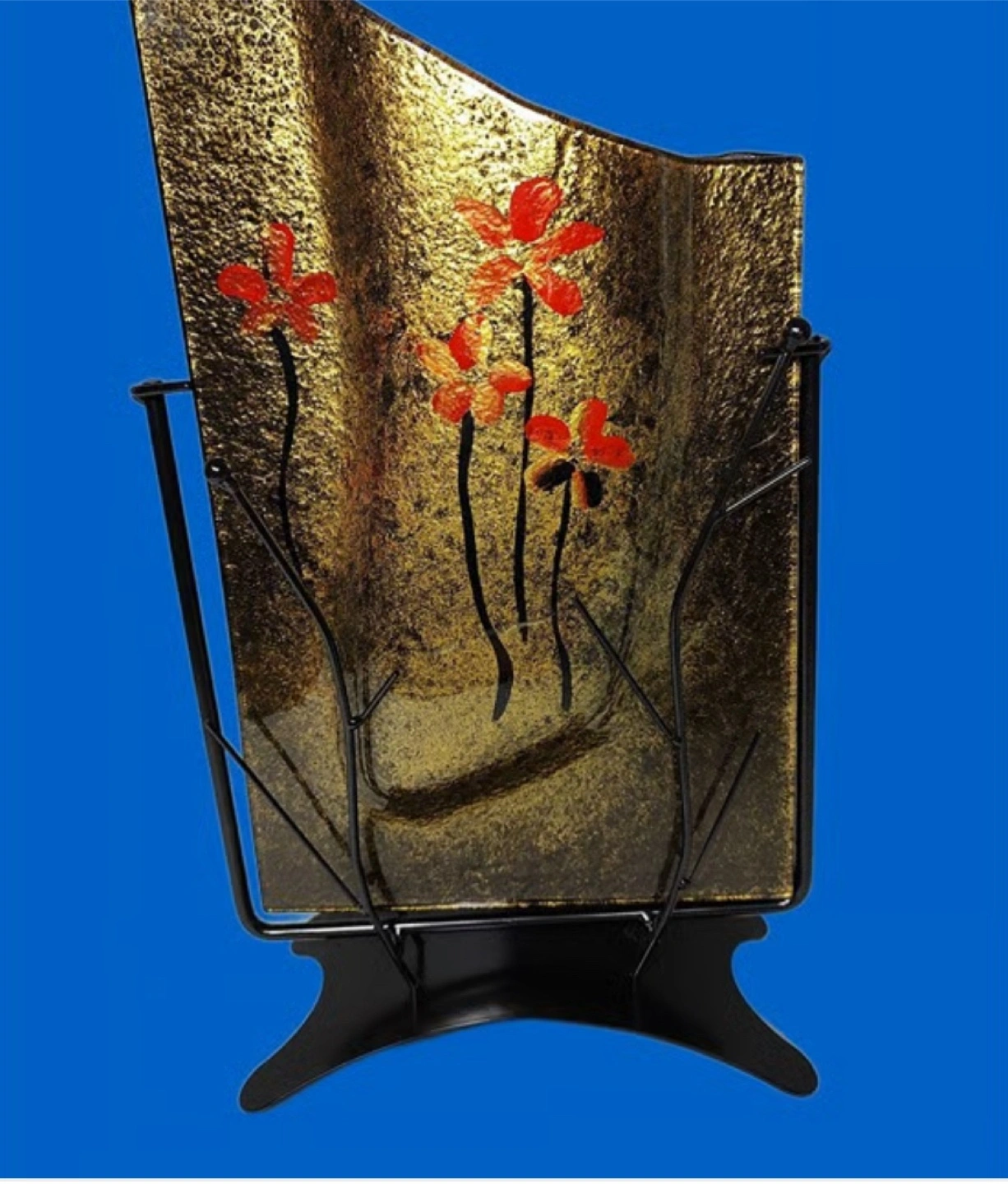 The elegant handcrafted decorative glass vase features a striking hand painted vibrant red flowers design on a shimmering gold background, housed in a black metal stand.