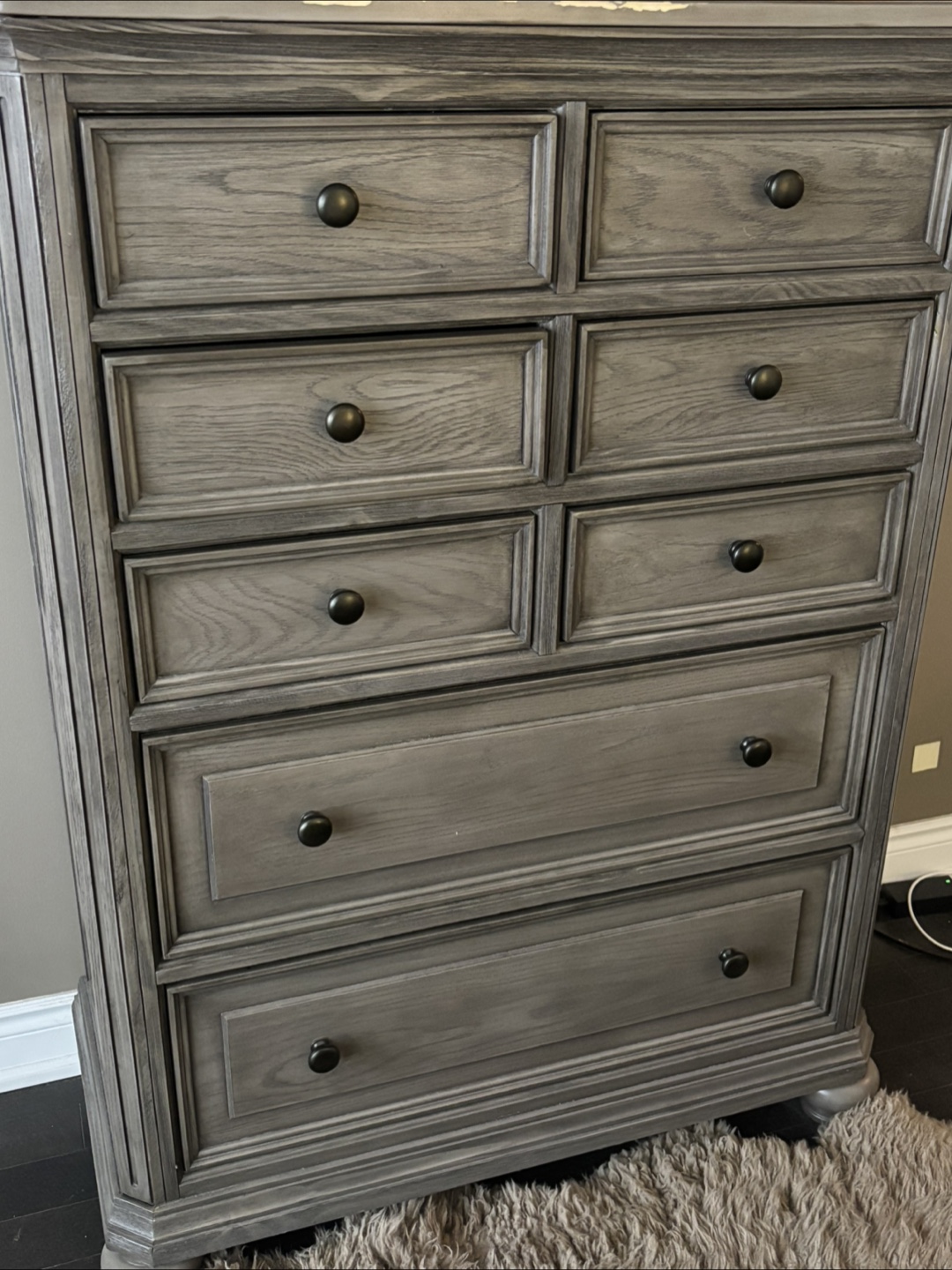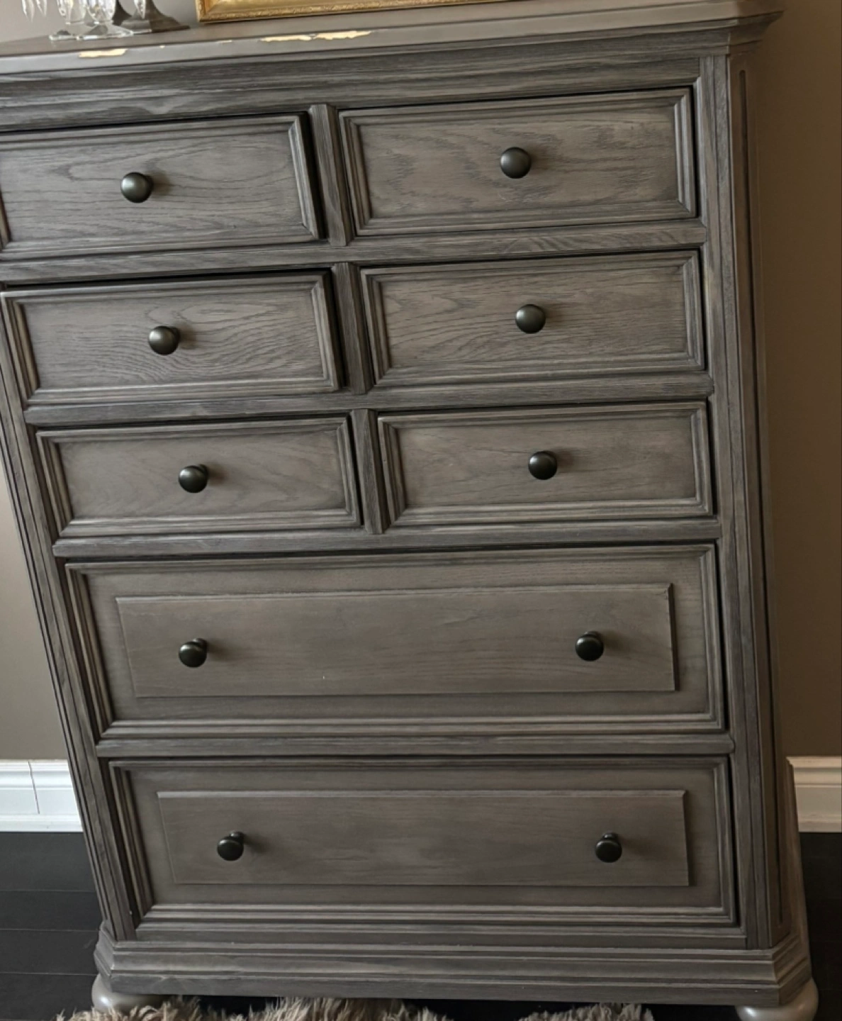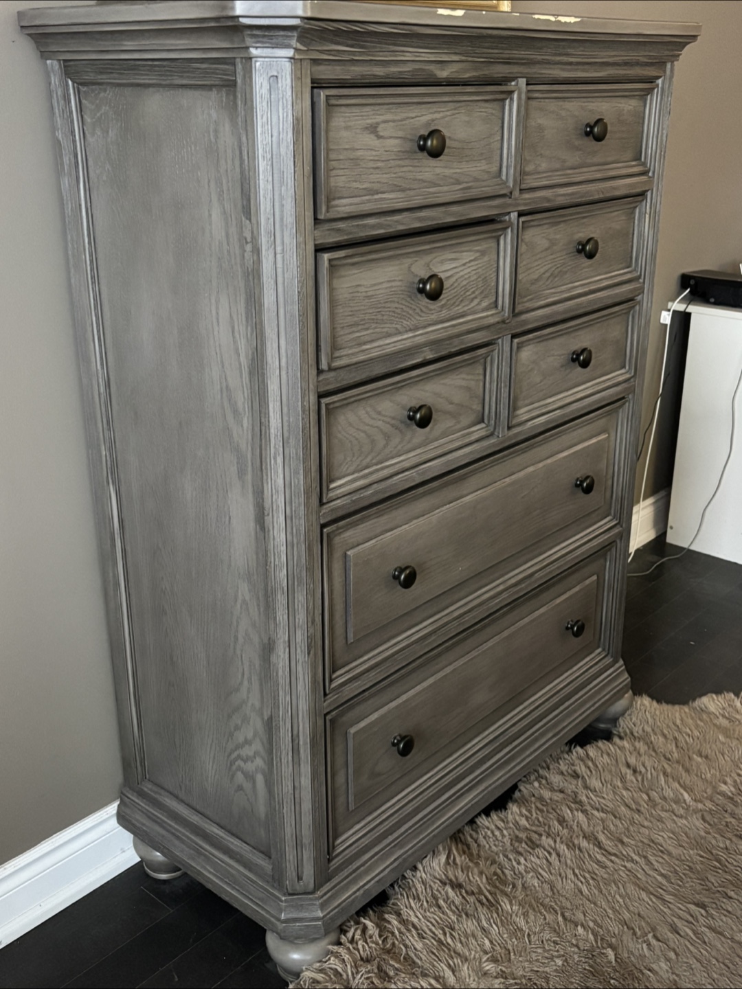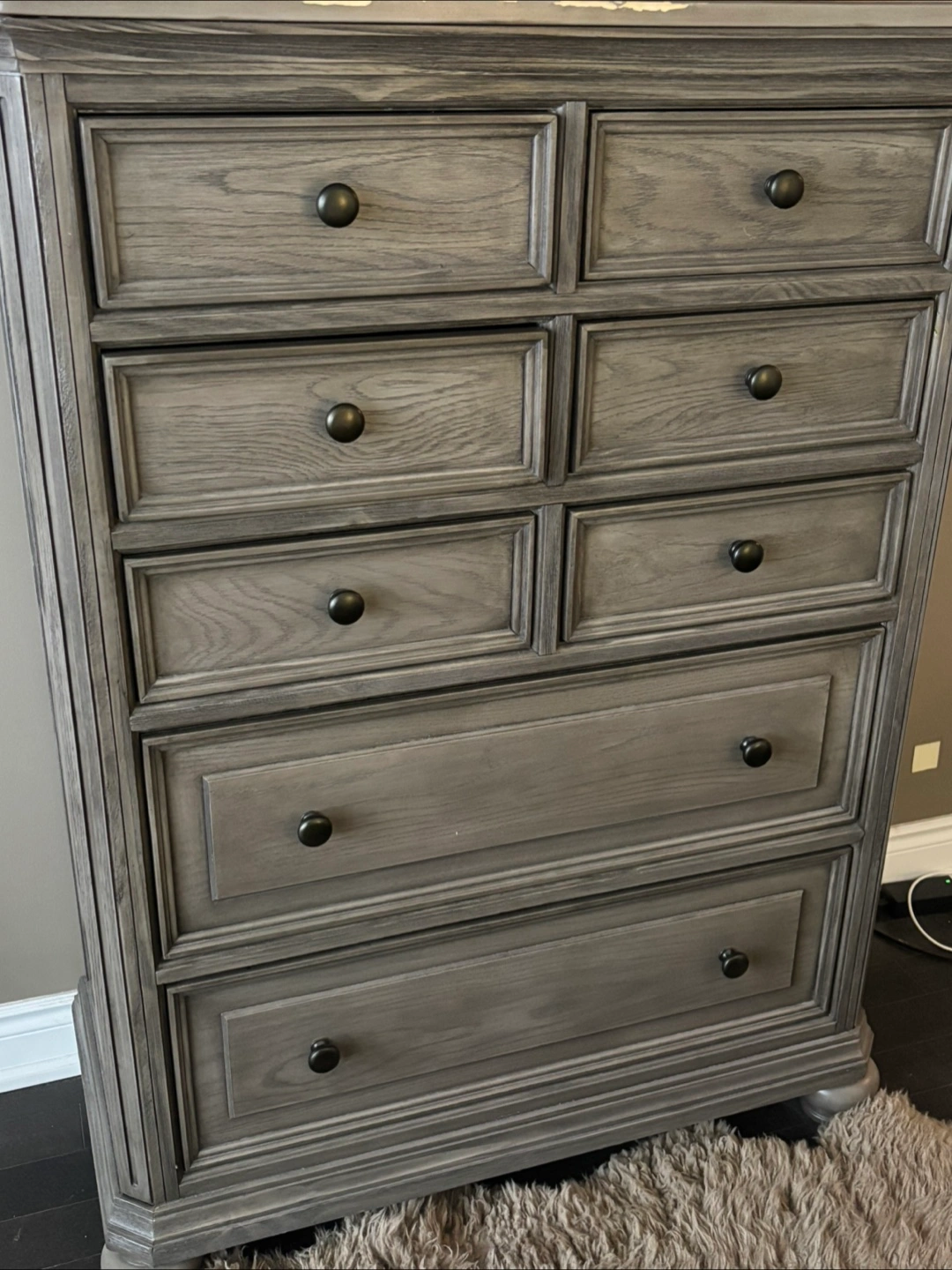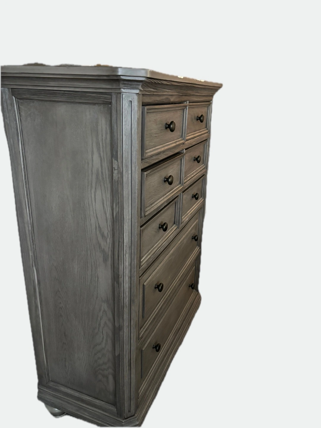 Wooden dresser with eight drawers. Each drawer features a round, black knob. The dresser is a grey colour. The dresser is perfect for storing your treasured items.
