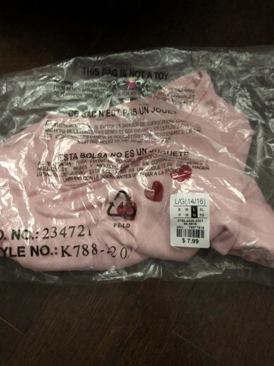2 cute baby tee shirts inside a plastic bag. L/G (14/16) size. Perfect for a relaxing evening at home.