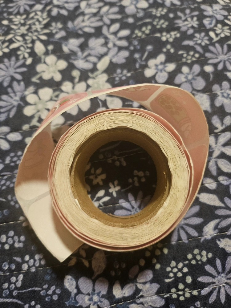 A roll of stickers. Pink with drawings. Will add a bit of joy to any surface.