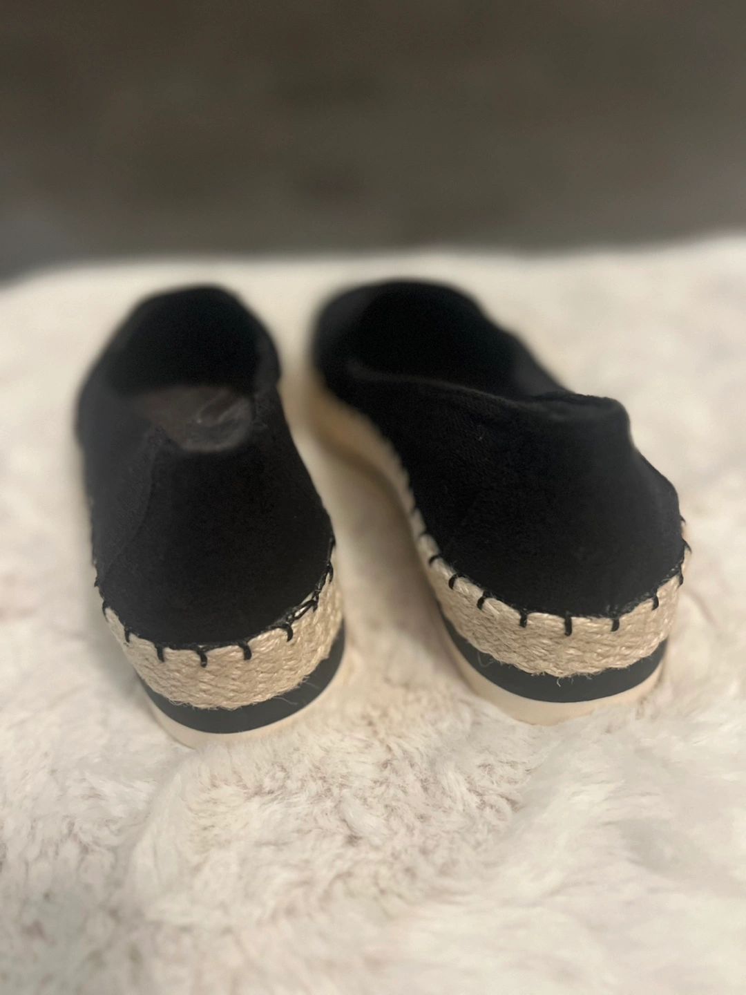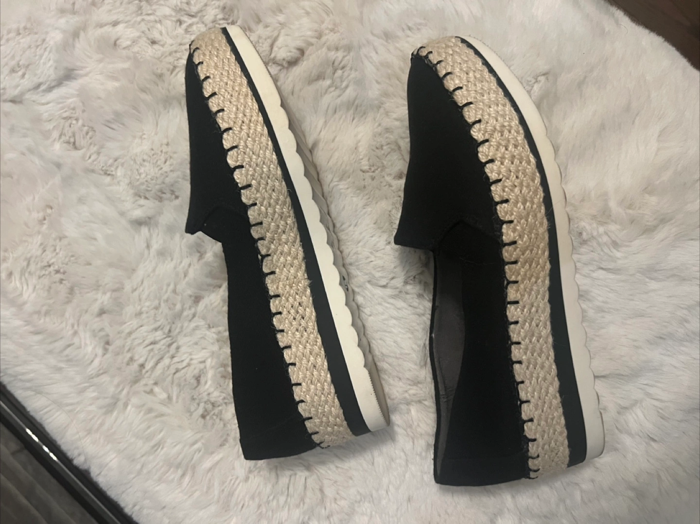 A pair of black canvas slip-on shoes. White soles. Rope-like detailing around the edges.