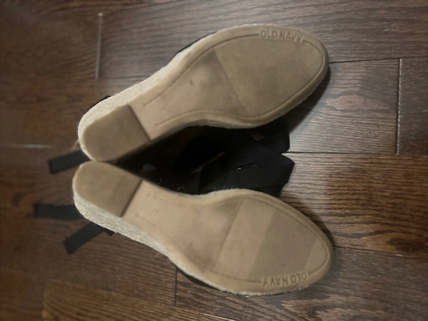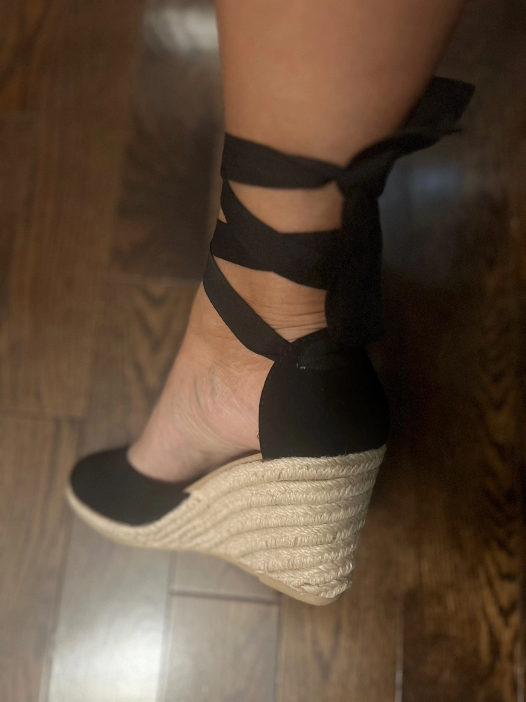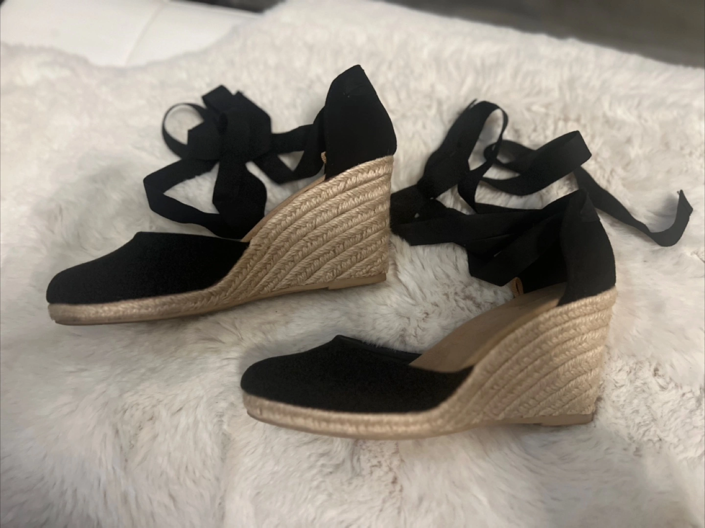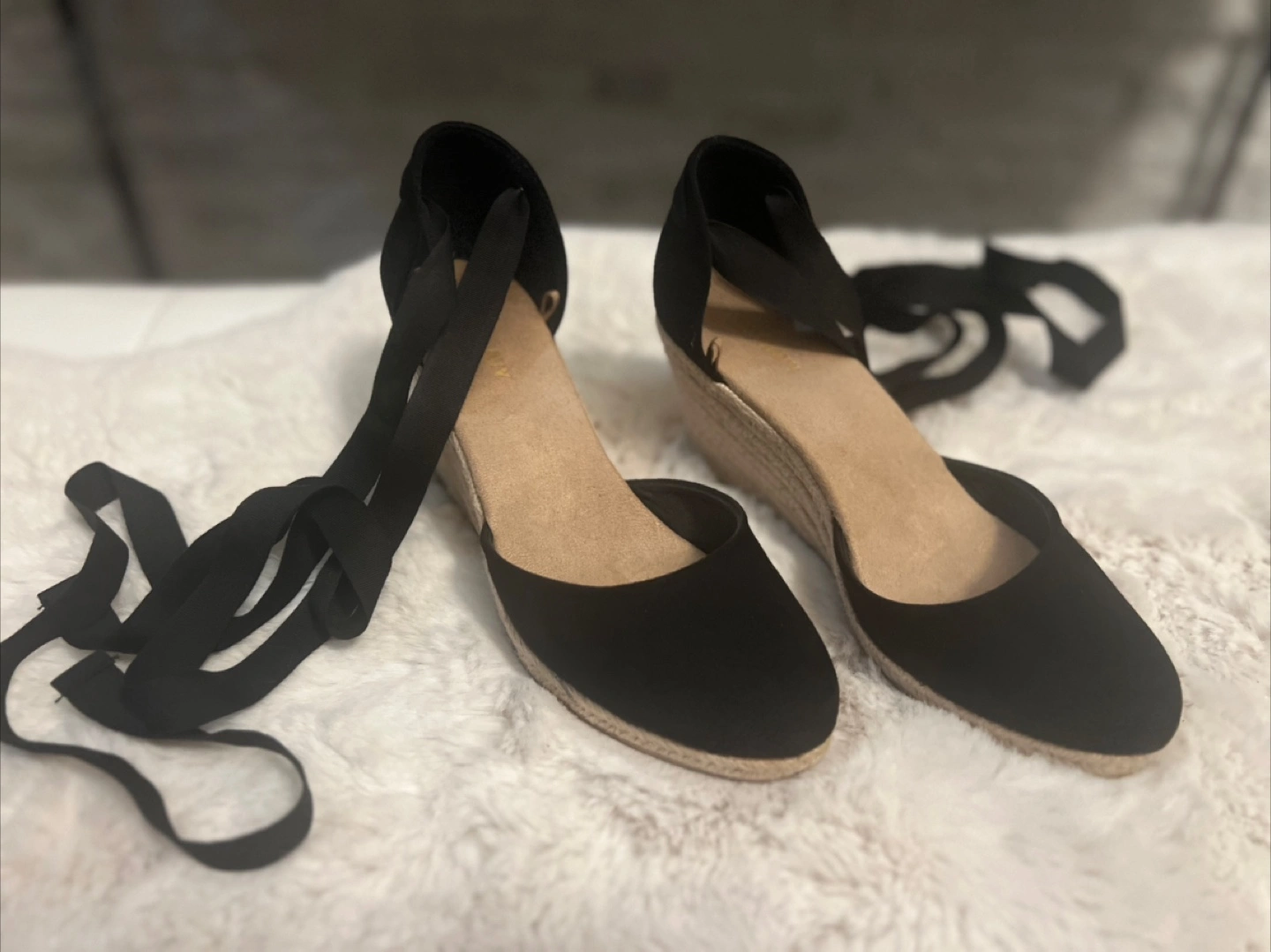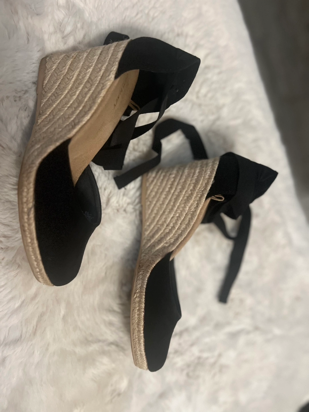 Very comfy black wedge sandals with wrap-around ankle ties. They feature a woven jute sole. They look great paired with shorts, skirts, dresses, capris or palazzo pants which show off the ankle ties. Worn 3 or 4 times. Can no longer wear due to bunion on left foot. Pick up in Brampton.
