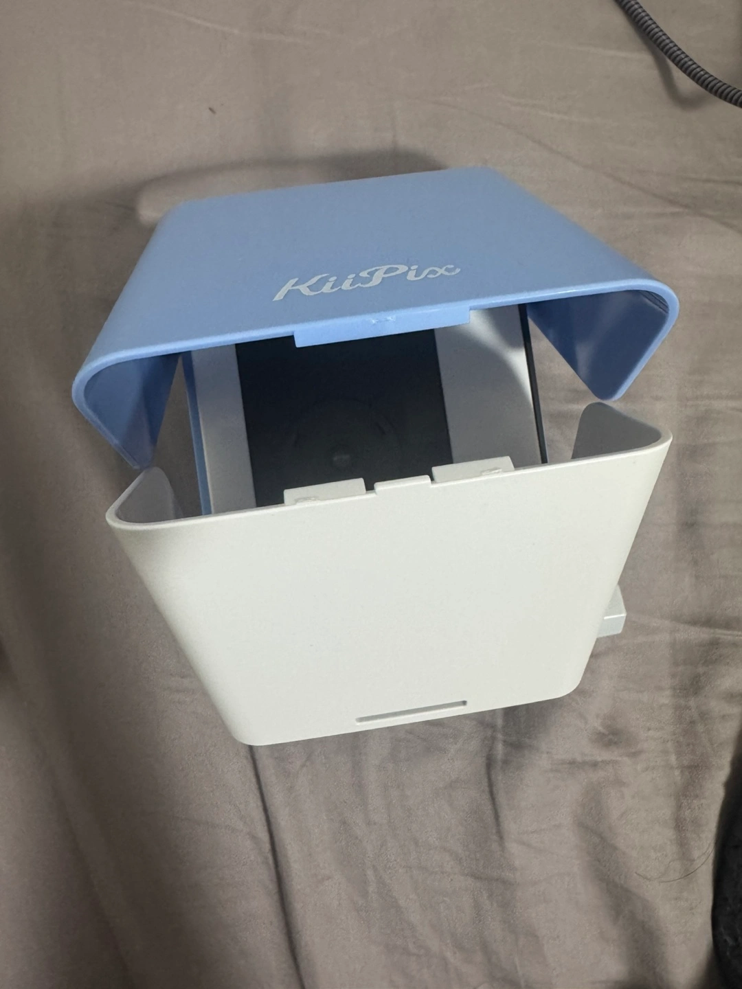 39A KiiPix instant photo printer in white and blue. Features a square shape. Could be a great way to print your memories and save them.