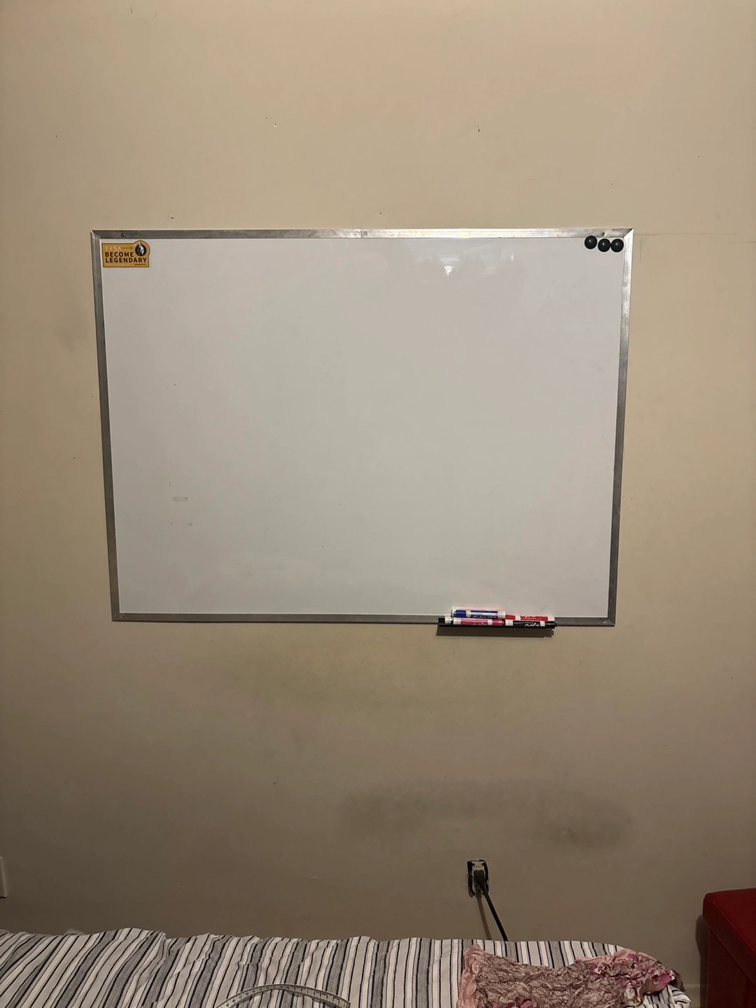 Rectangular whiteboard with a silver frame. Includes a holder for markers. Some markers are visible in the photos. The perfect way to jot down reminders or practice creative writing to calm the mind.