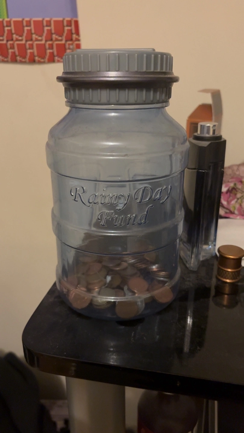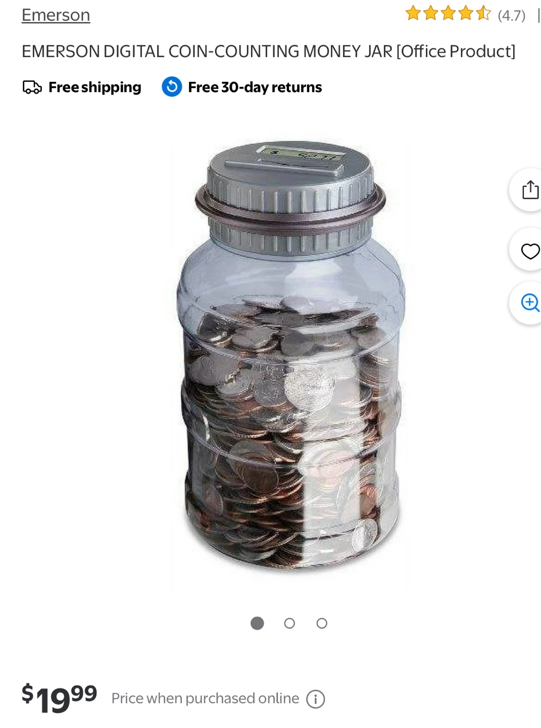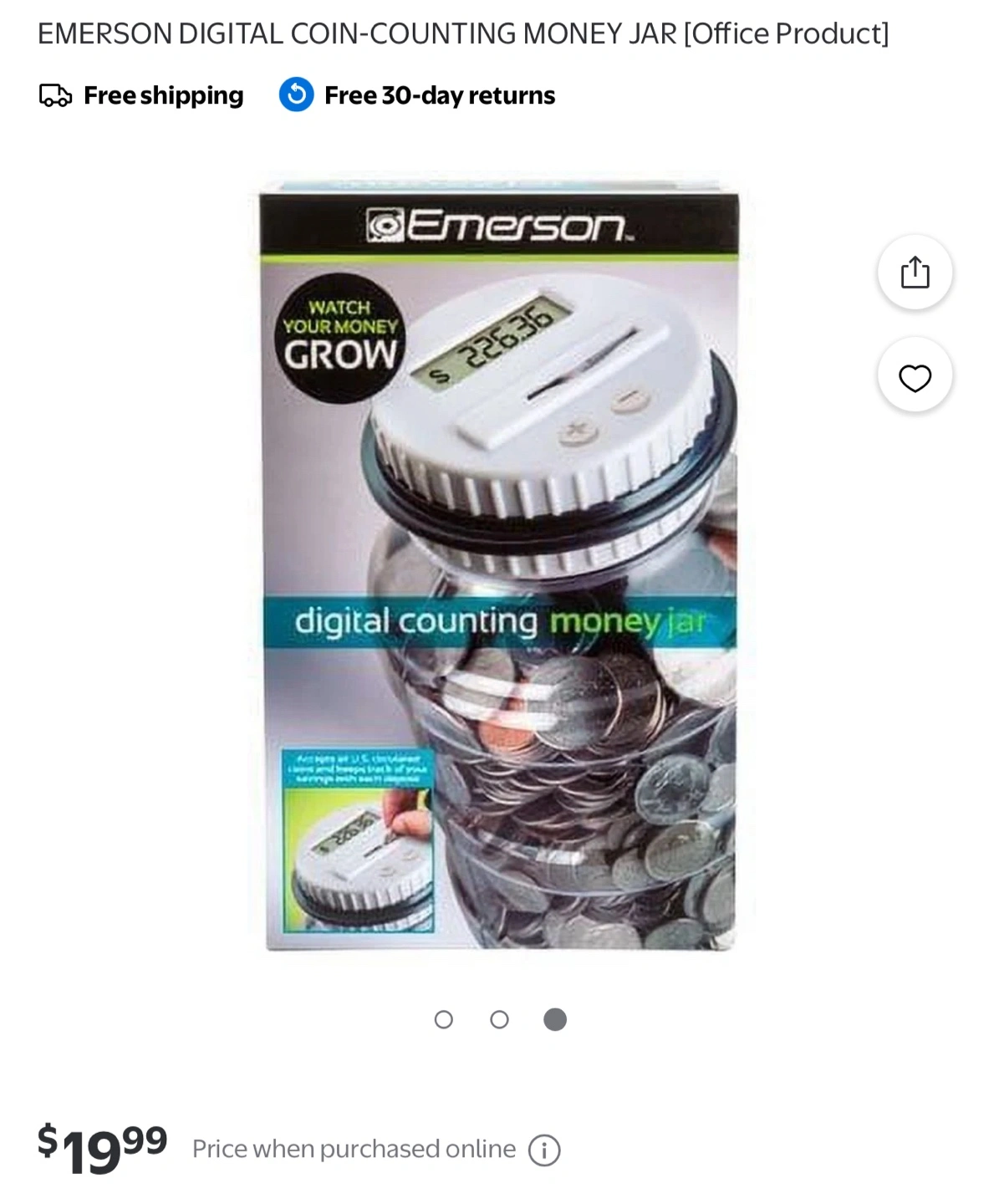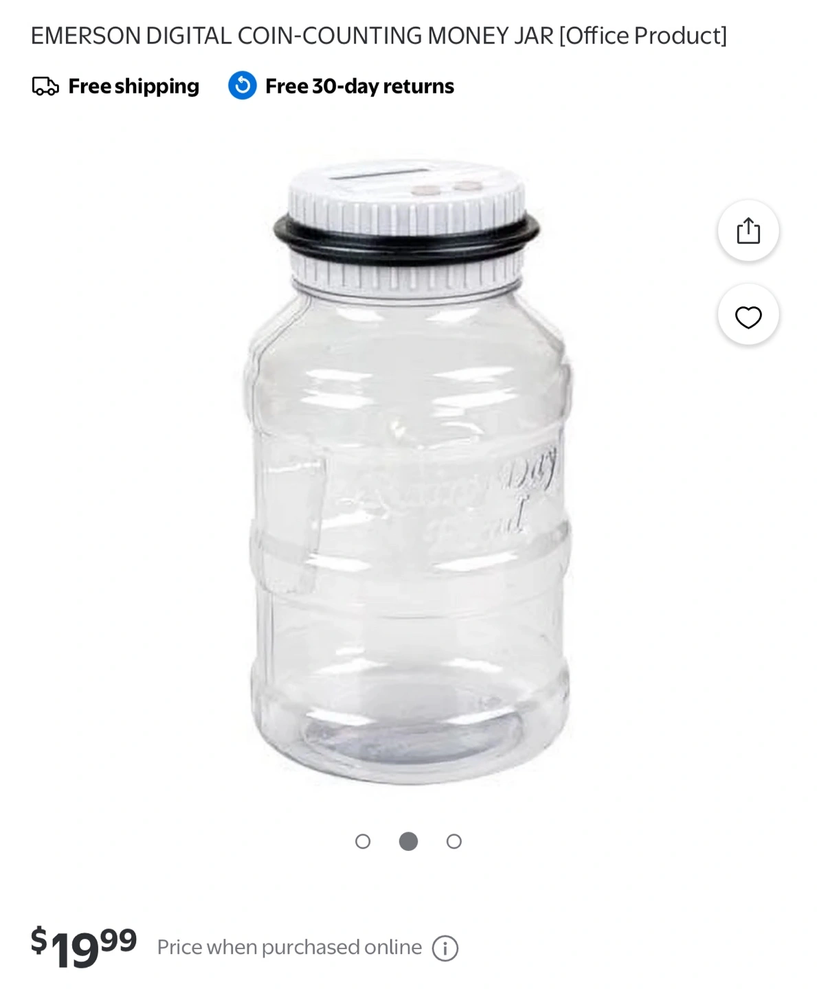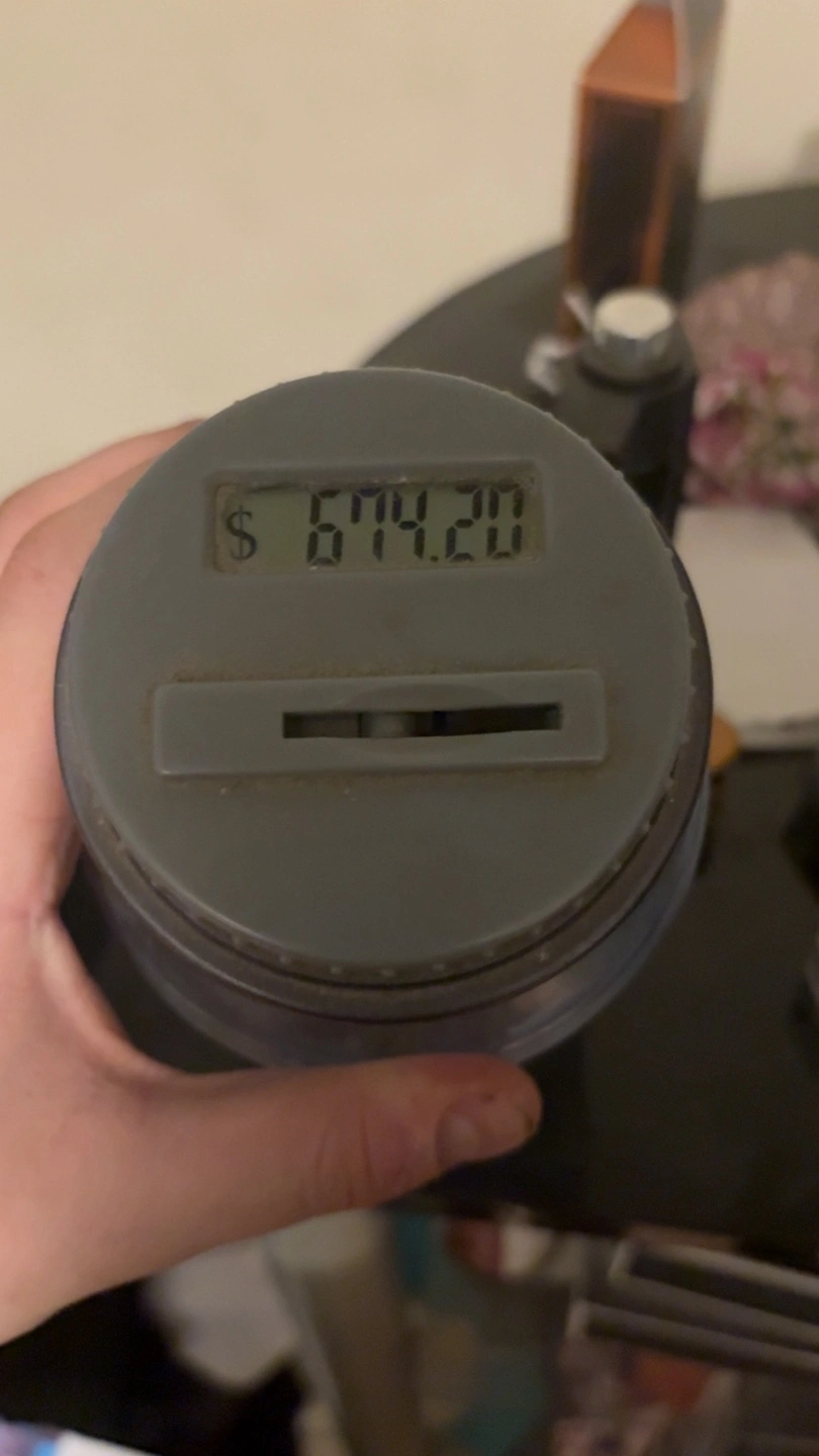 Clear jar with a grey lid. Coin slot on the lid. It features a digital display. A perfect item for those who want to watch their savings grow over time.