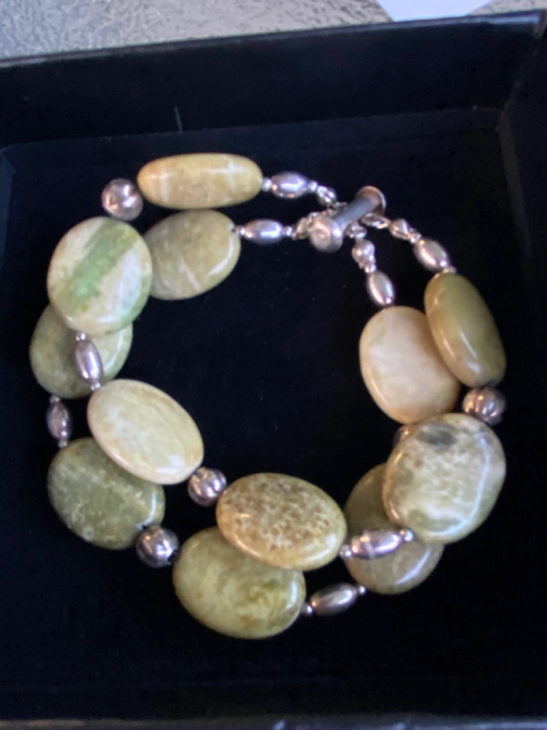 The bracelet is strung with genuine silver findings, offering a refined contrast to the earthy green tones of the stone. Its double strand design adds dimension and vintage charm β perfect for collectors, jewelry lovers, or anyone who appreciates natural materials with heritage.