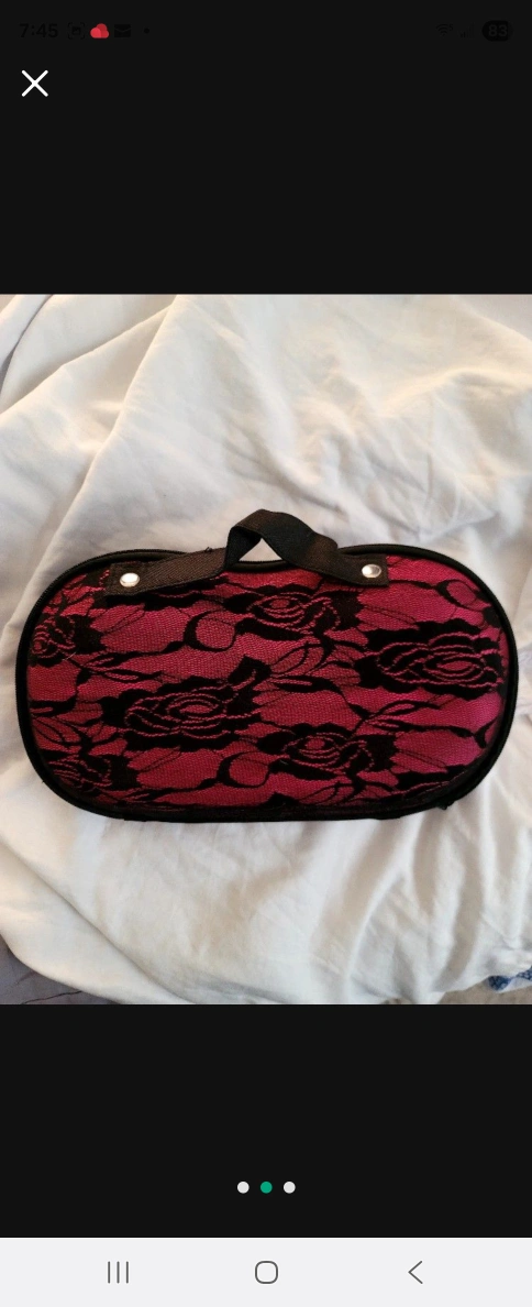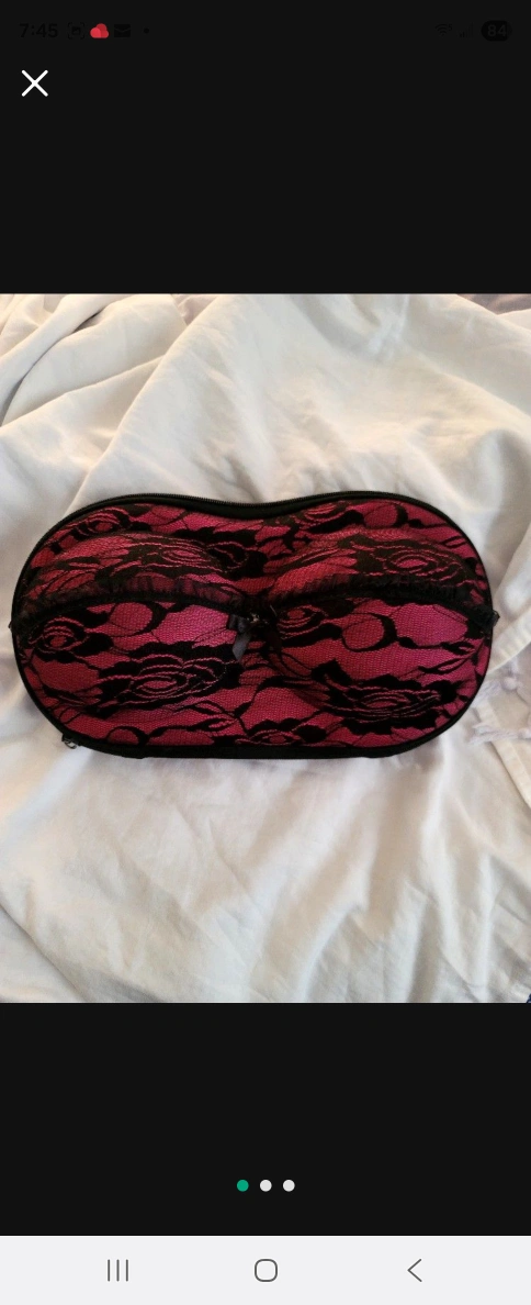 A beautiful bra case. Features a black strap, a double zipper closure, and black and pink lace detailing. A great way to keep your bras safe while you are traveling, allowing you to have peace of mind about your valuable belongings.