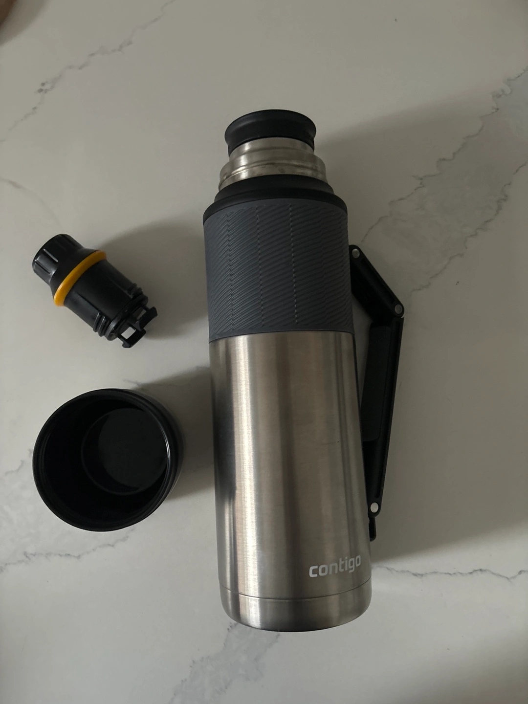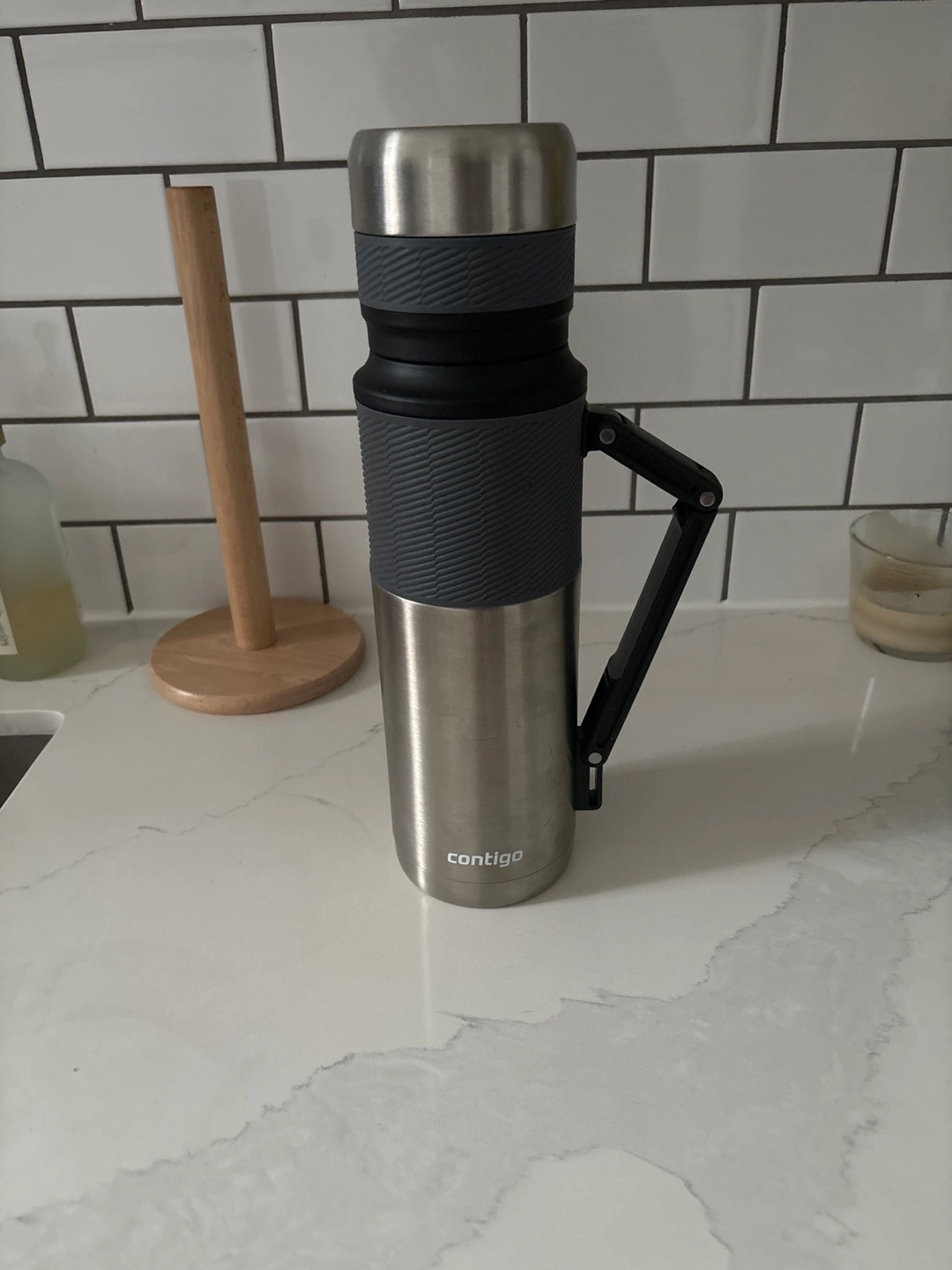 40 oz Stainless steel travel mug. Has a black handle, and a grey silicone grip.