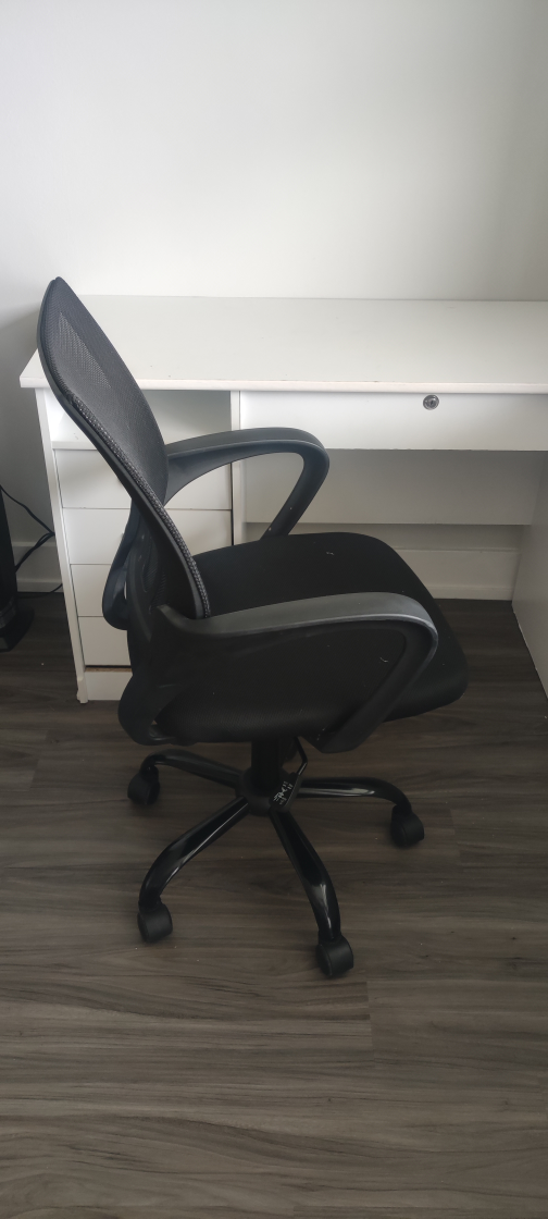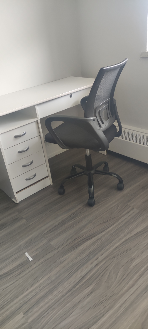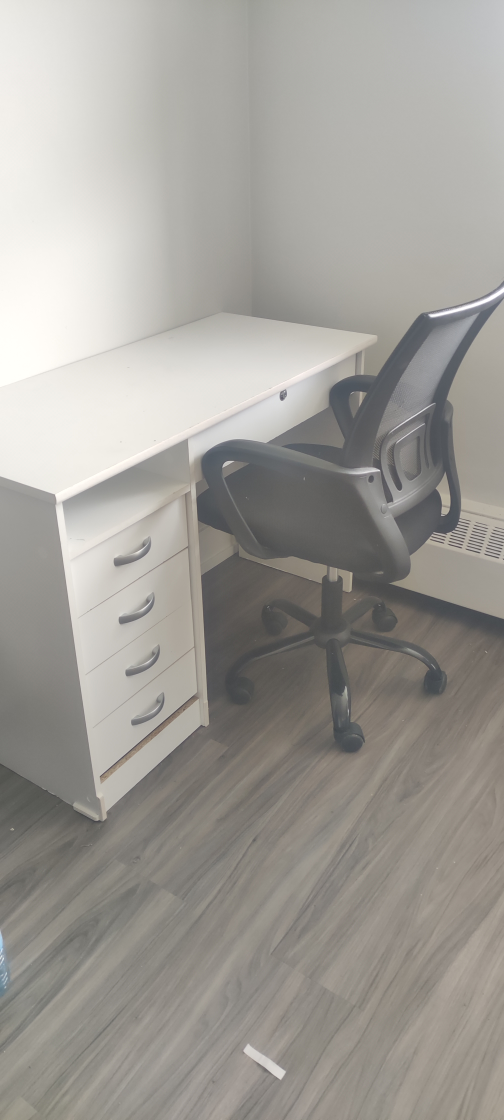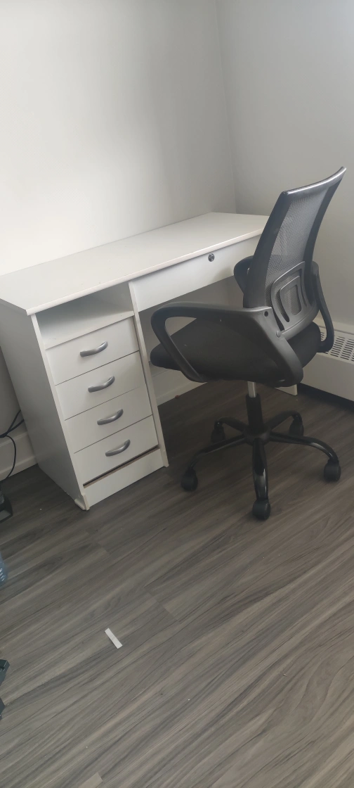A simple white desk with drawers. Included is a comfortable office chair. A great place to sit and work, offering focus and productivity.