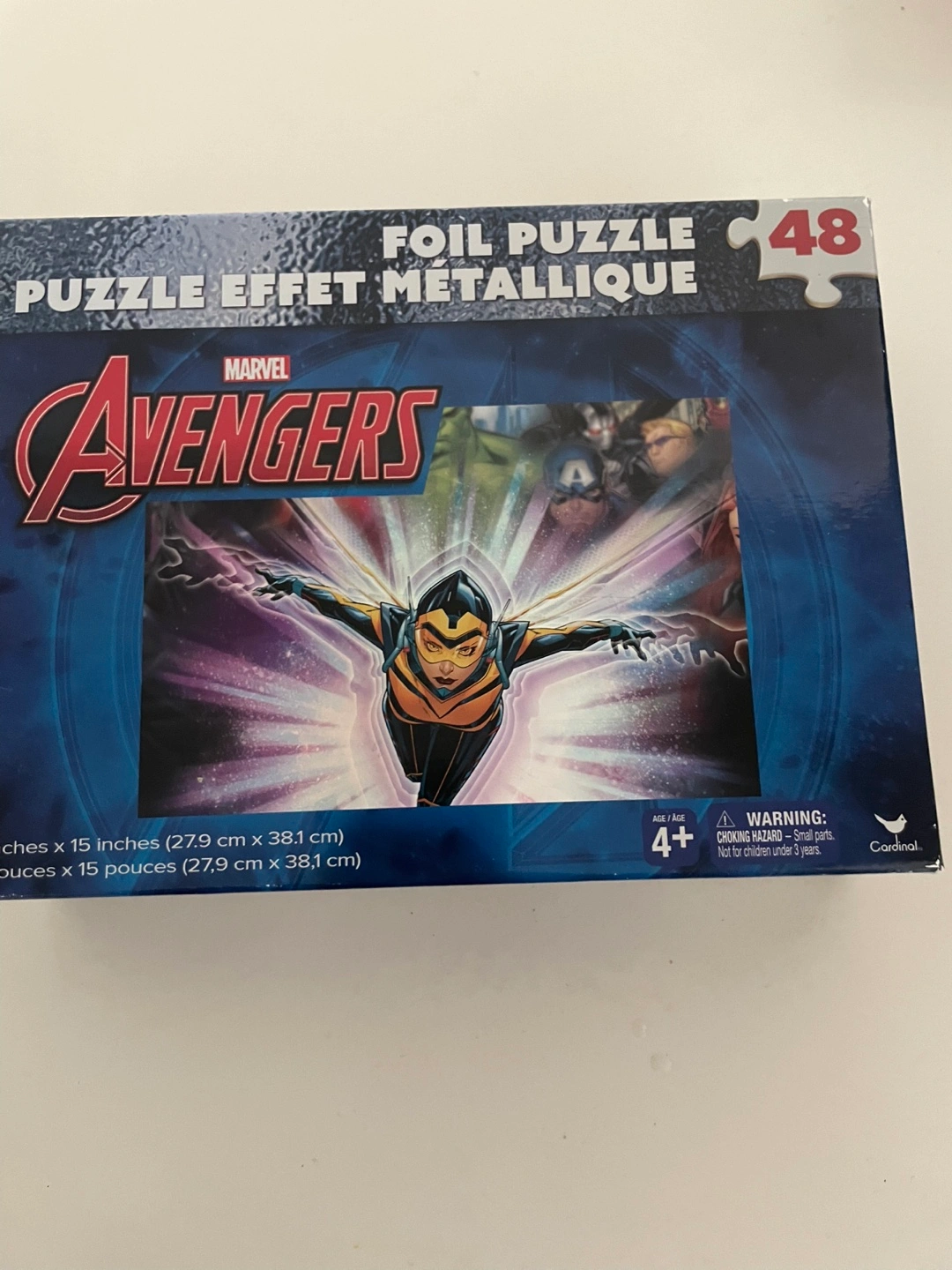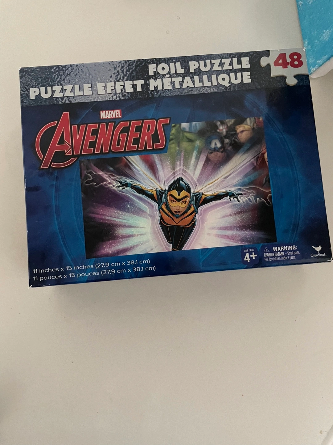 A puzzle of the Avengers. Contains multiple puzzle pieces. A great activity for a quiet afternoon.
