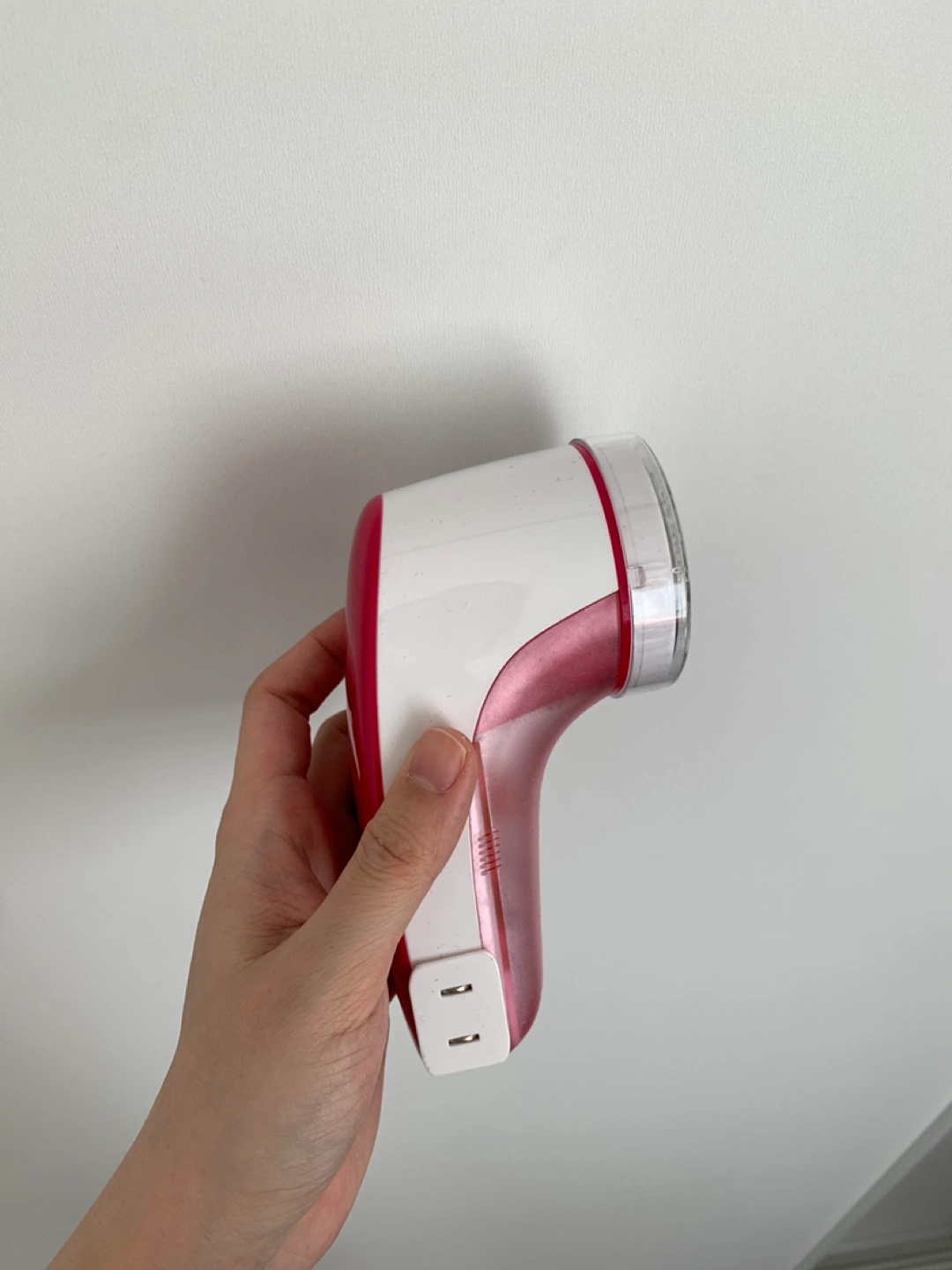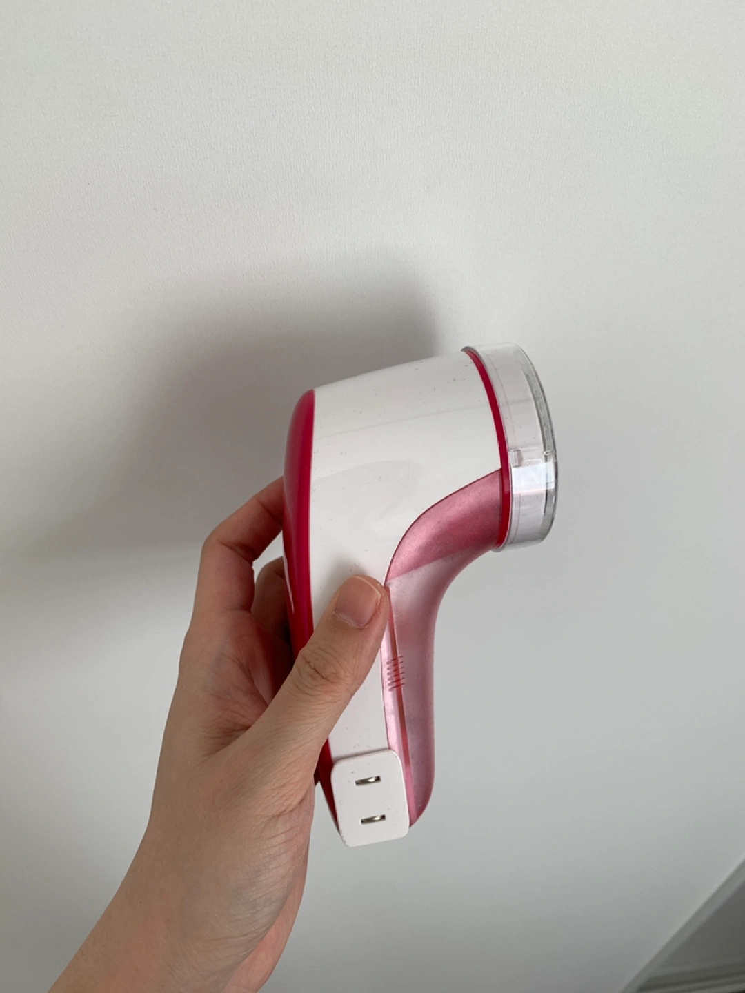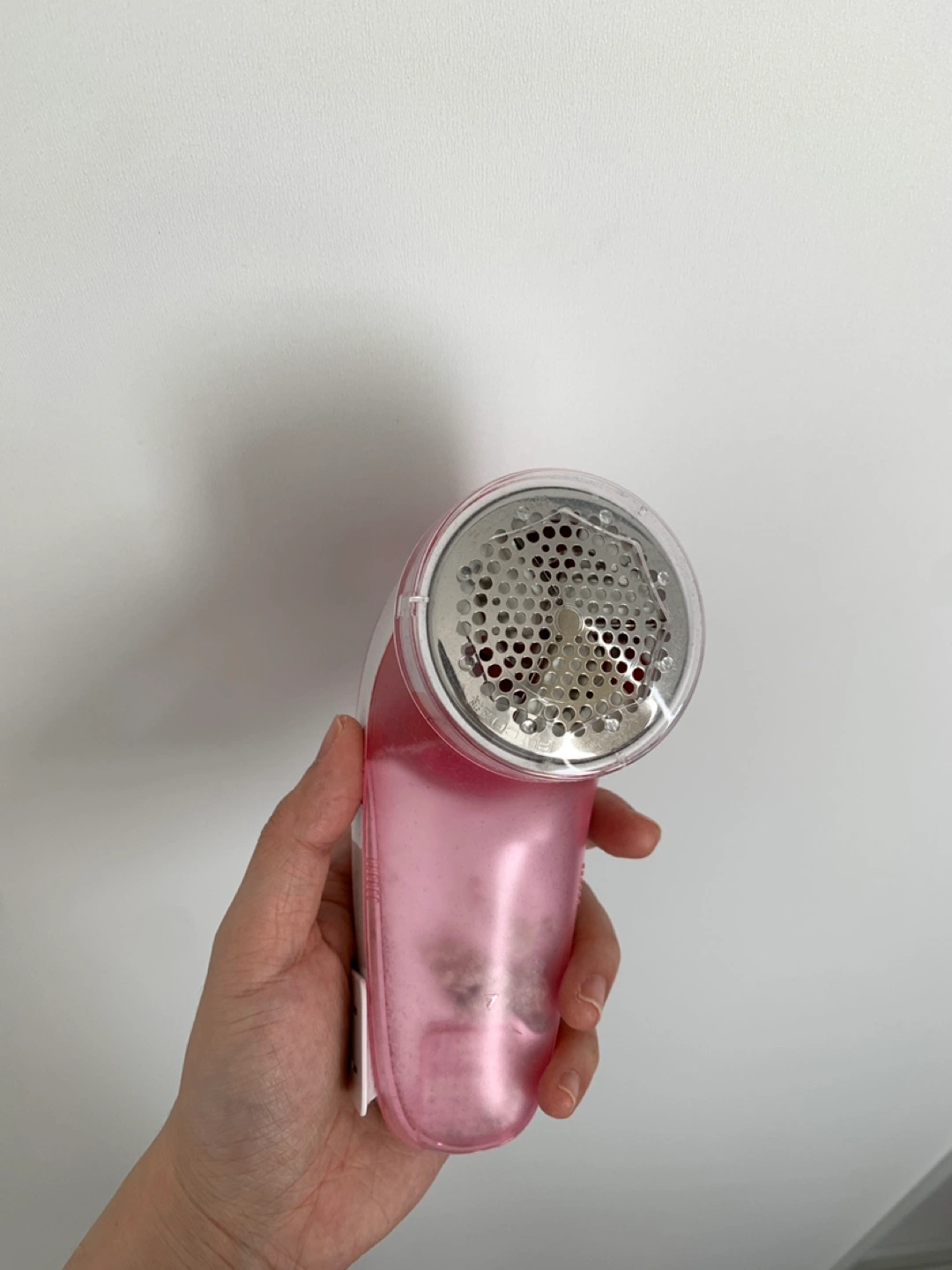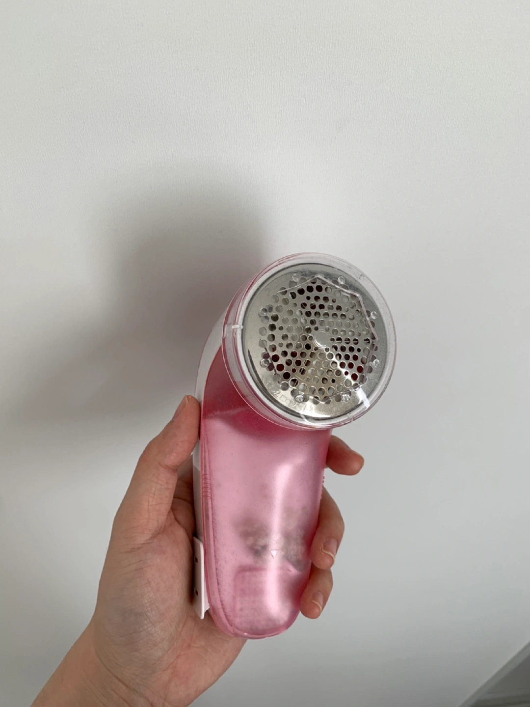 A handheld fabric shaver. Features a clear plastic guard around the head. The body is pink and white. A fantastic tool to have on hand for keeping your clothes looking fresh.