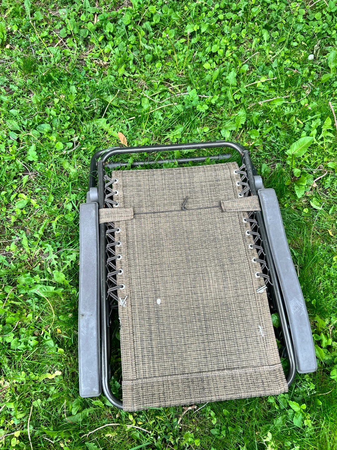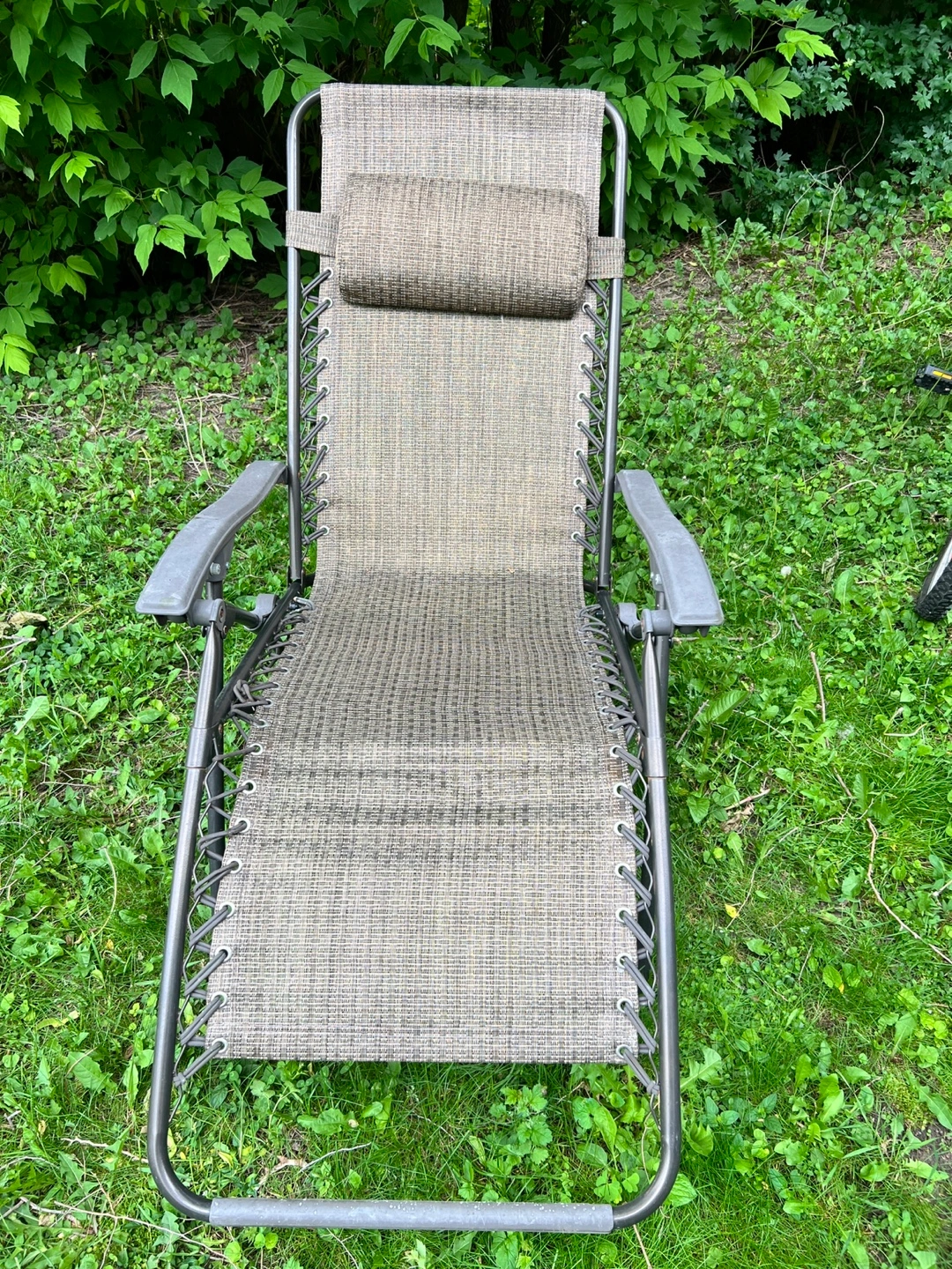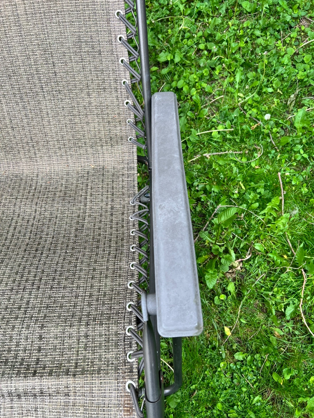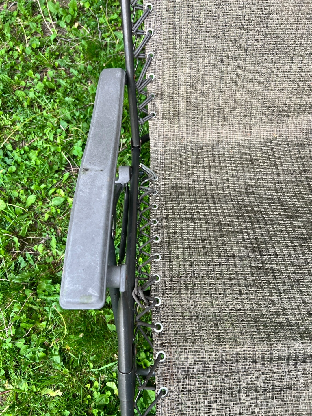 I'm selling a lovely outdoor lounge chair. It has a grey mesh fabric, armrests, and a supportive headrest. The chair is suspended by a bungee cord system. This chair would be perfect for you to relax and enjoy a nice summer afternoon. Adjustable headrest