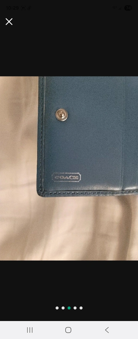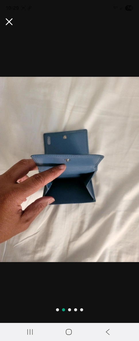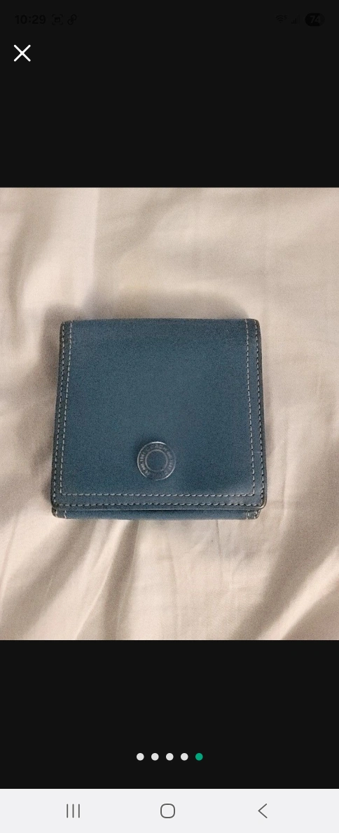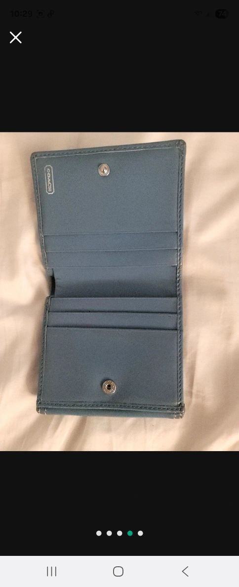 A beautiful blue wallet, with a snap closure. Featuring a card holder and coin purse. This wallet is just what you need to keep your things safe.