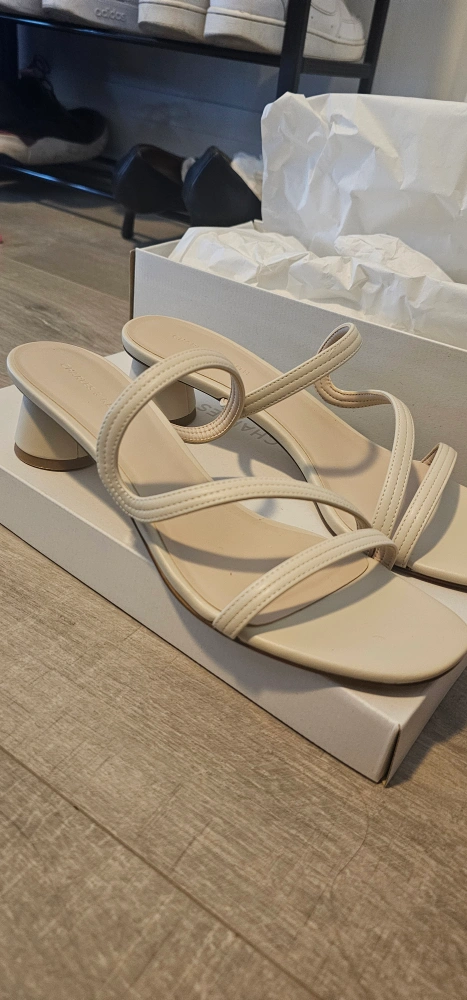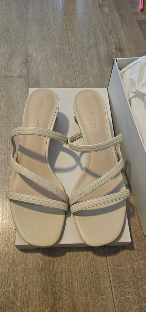 343brand new, never worn. size 9. sandals are beautiful but too small and return is a hassle. https://www.charleskeith.com/ca/CK1-60190286_CHALK_39.html Cream-coloured heeled sandals, featuring multiple straps and a round heel. They sit in an original box with tissue paper. Perfect for taking a relaxing stroll on a sunny day.