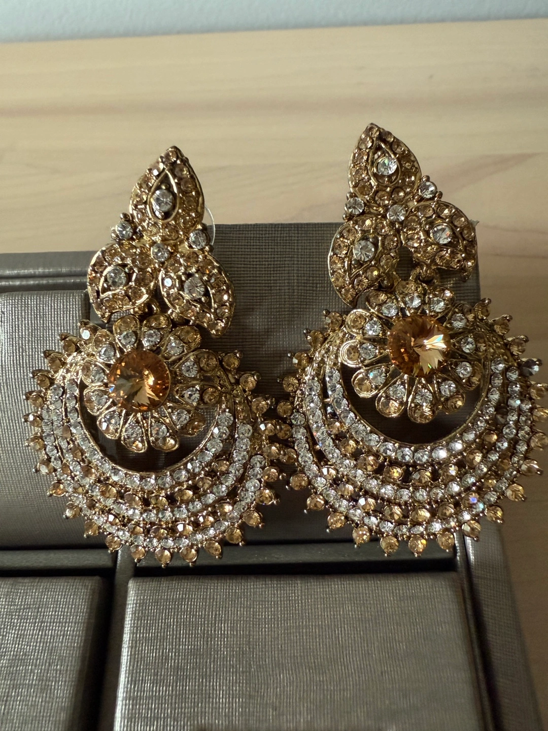 1000+Pair of dangle earrings. Decorated with sparkling crystals. Features a gold tone. These earrings would be perfect to wear for a wedding or a special occasion, and I hope you find them as relaxing as I do.