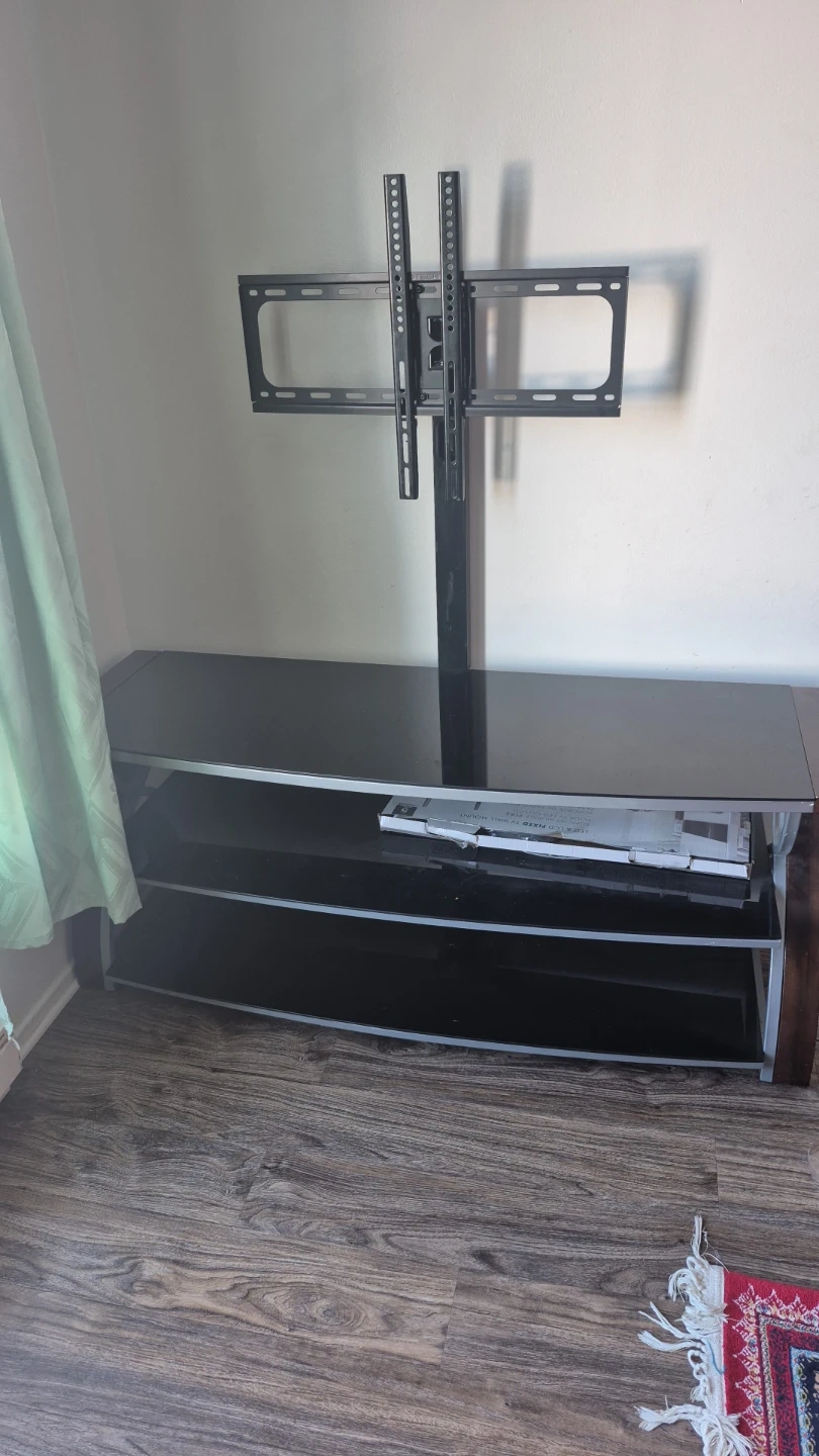 This is a sleek black glass TV stand featuring multiple shelves for media consoles or decor. It comes with a built-in TV mount, perfect for setting up your entertainment system. The stand has a modern design with a glass top and shelves supported by a sturdy frame.