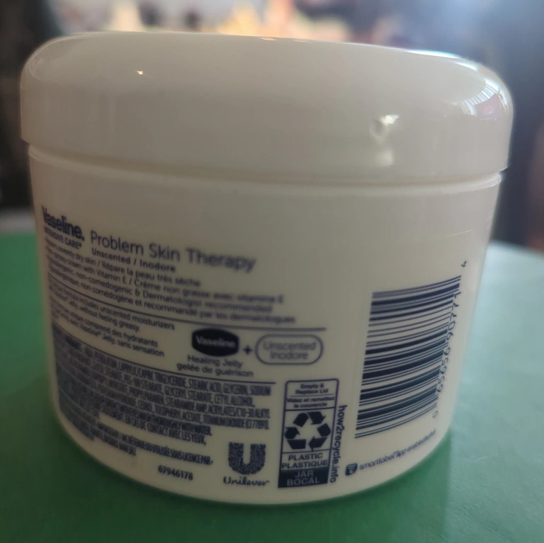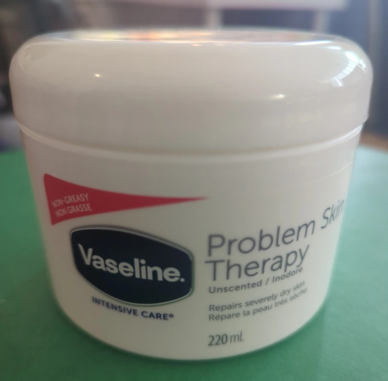 Jar of Vaseline skin therapy cream. Unscented formula, good for sensitive skin. A perfect way to soothe your skin after a long day.