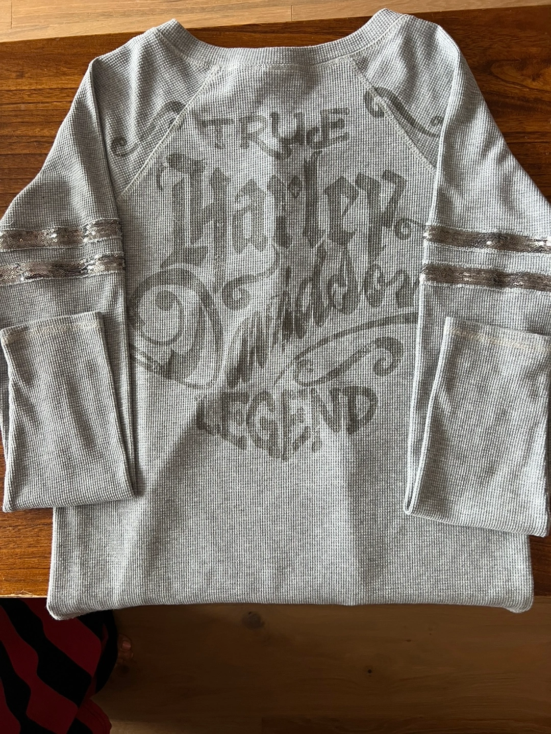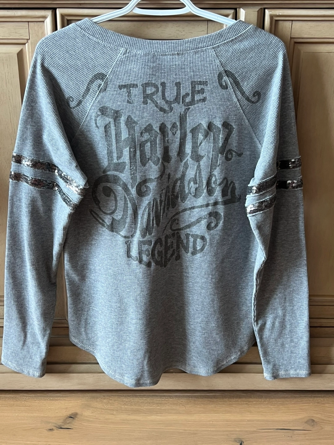 A grey waffle knit Harley Davidson long sleeve top. It features a scoop neck and a button-up henley. Sequin details on both sleeves. New without tags