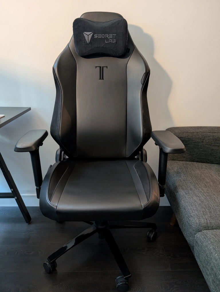 A gaming chair in black. Has a headrest pillow, adjustable armrests, and caster wheels. The chair was purchased directly from Secretlab for $712.95. chair is in excellent condition.