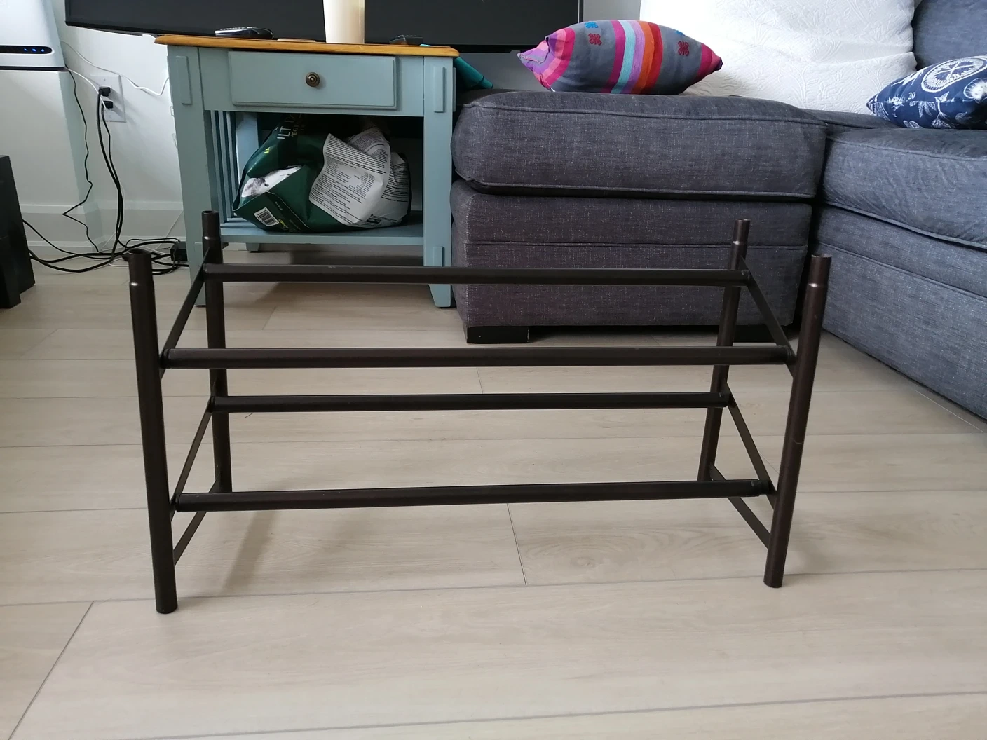 A dark metal shoe rack. Featuring two tiers and adjustable length to adjust to your needs. The rack is tall and rectangular in shape. This shoe rack will help you bring some order to your home. Missing top caps, that does not interfere with function.