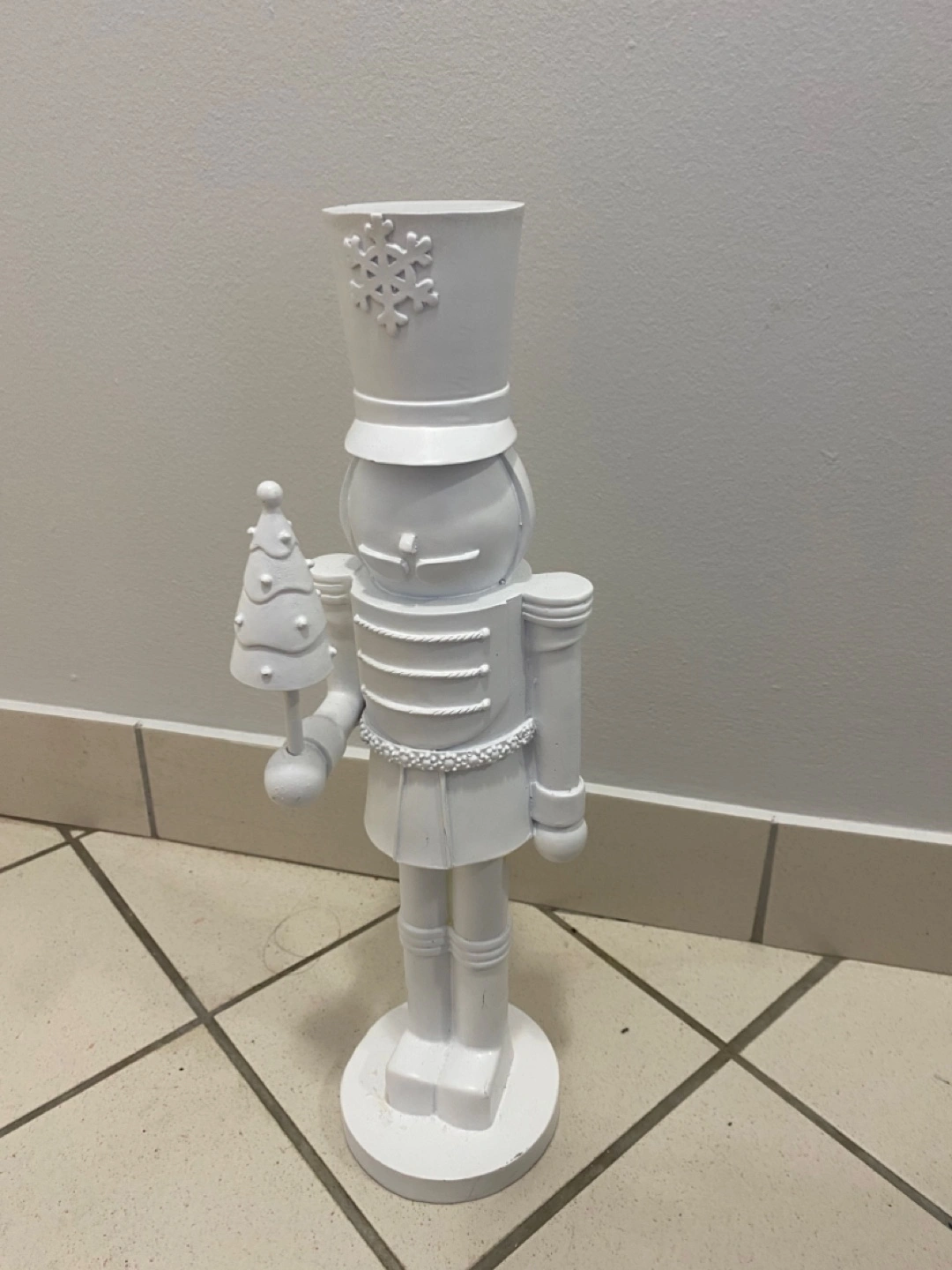 A festive nutcracker statue in white. Features a snowflake detail on the hat. Perfect for seasonal decor in any room. This statue can really bring a sense of peace and calm to your space.