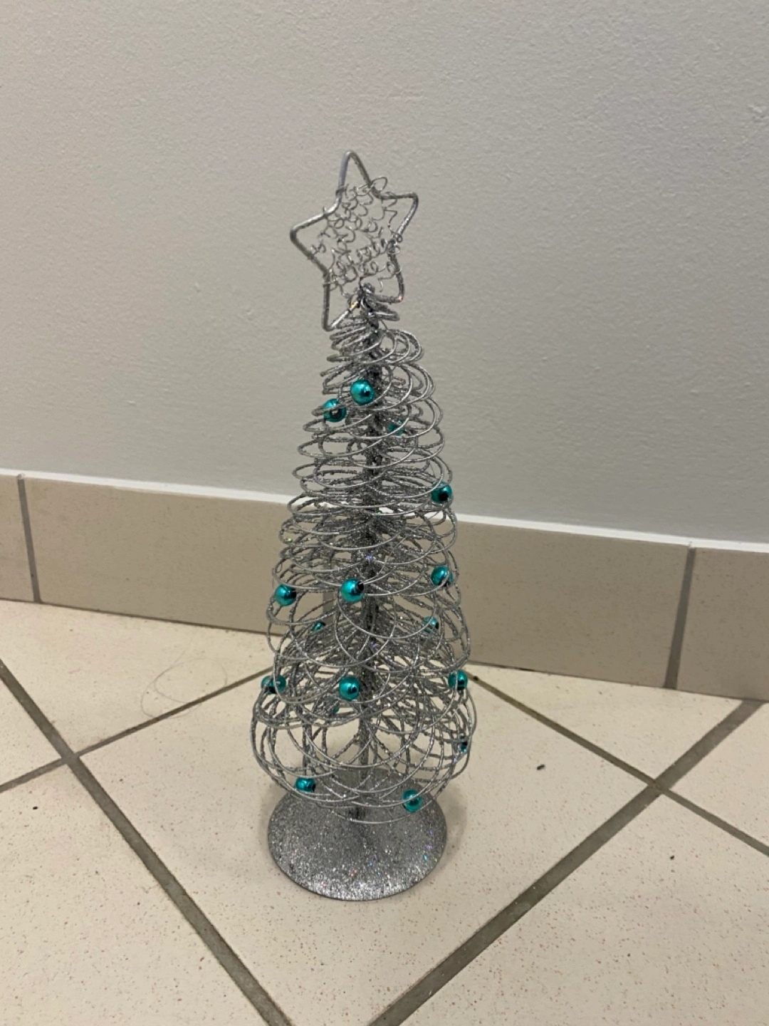 A delightful Christmas tree. Crafted from silver wire, it features small, teal-colored baubles and a star on top. You can use it to bring holiday cheer into any space by just placing it on a shelf or tabletop.