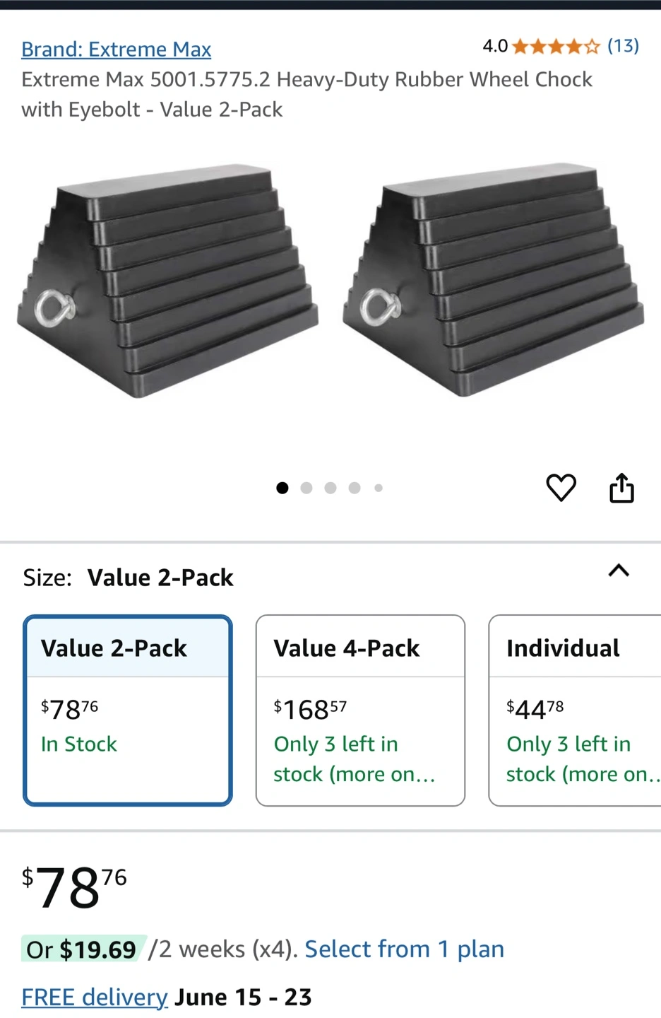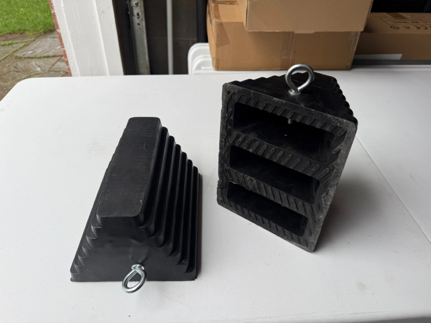 18Two heavy-duty rubber wheel chocks. Black in colour. Features a built-in eye bolt. Use these to keep your vehicle secure.
