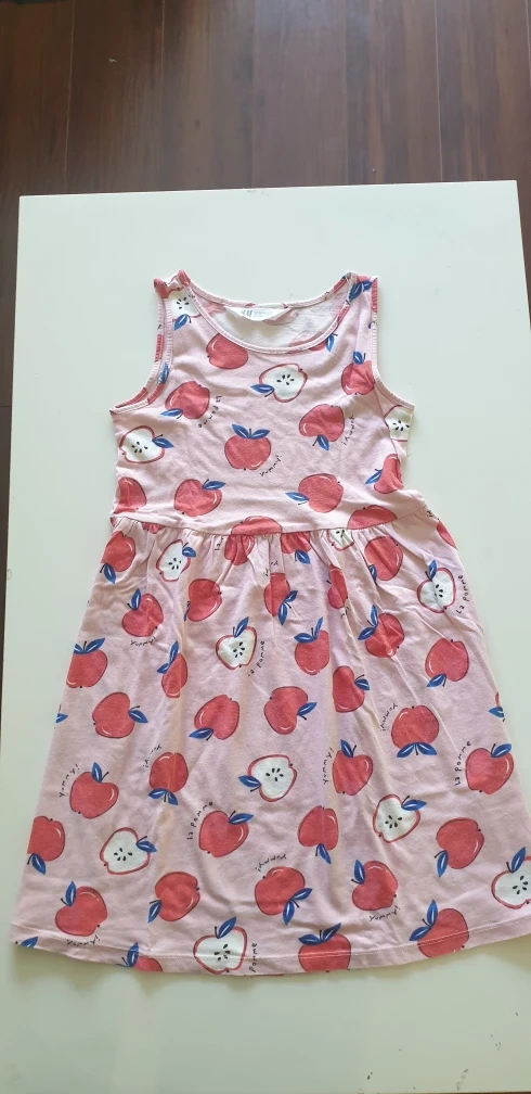 33The sleeveless dress features a charming apple print. It has a round neckline. A dress like this is perfect for a day out.