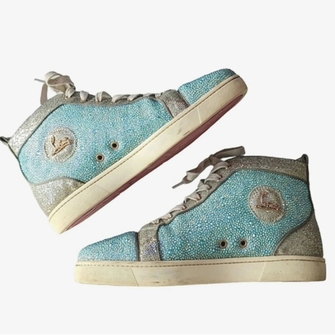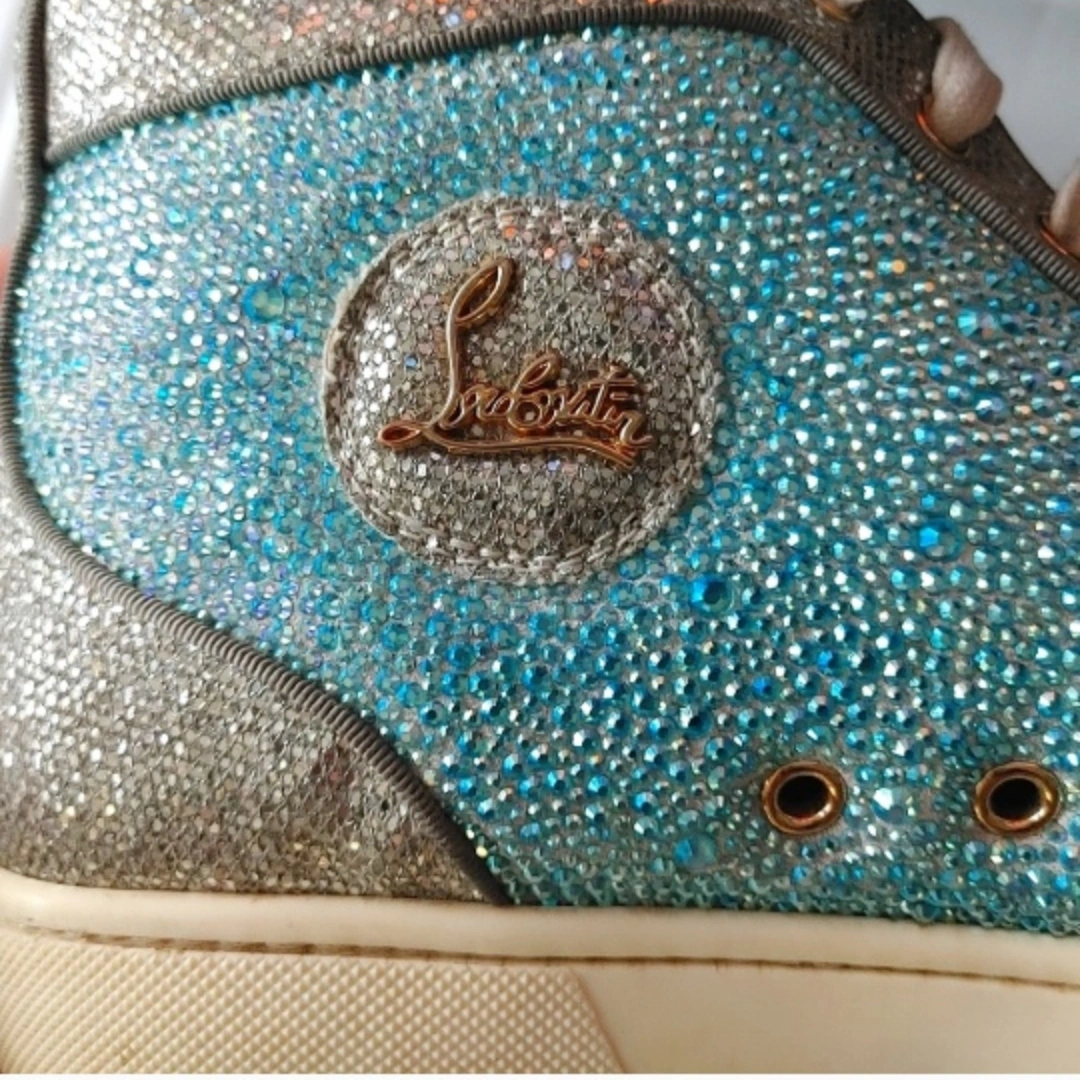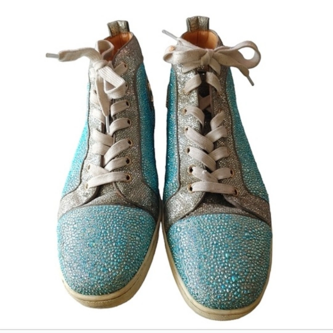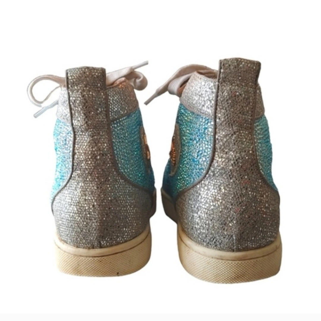 Authentic Christian Louboutin Blue & Silver Crystal Strass Louis Junior AB High Sneaker.