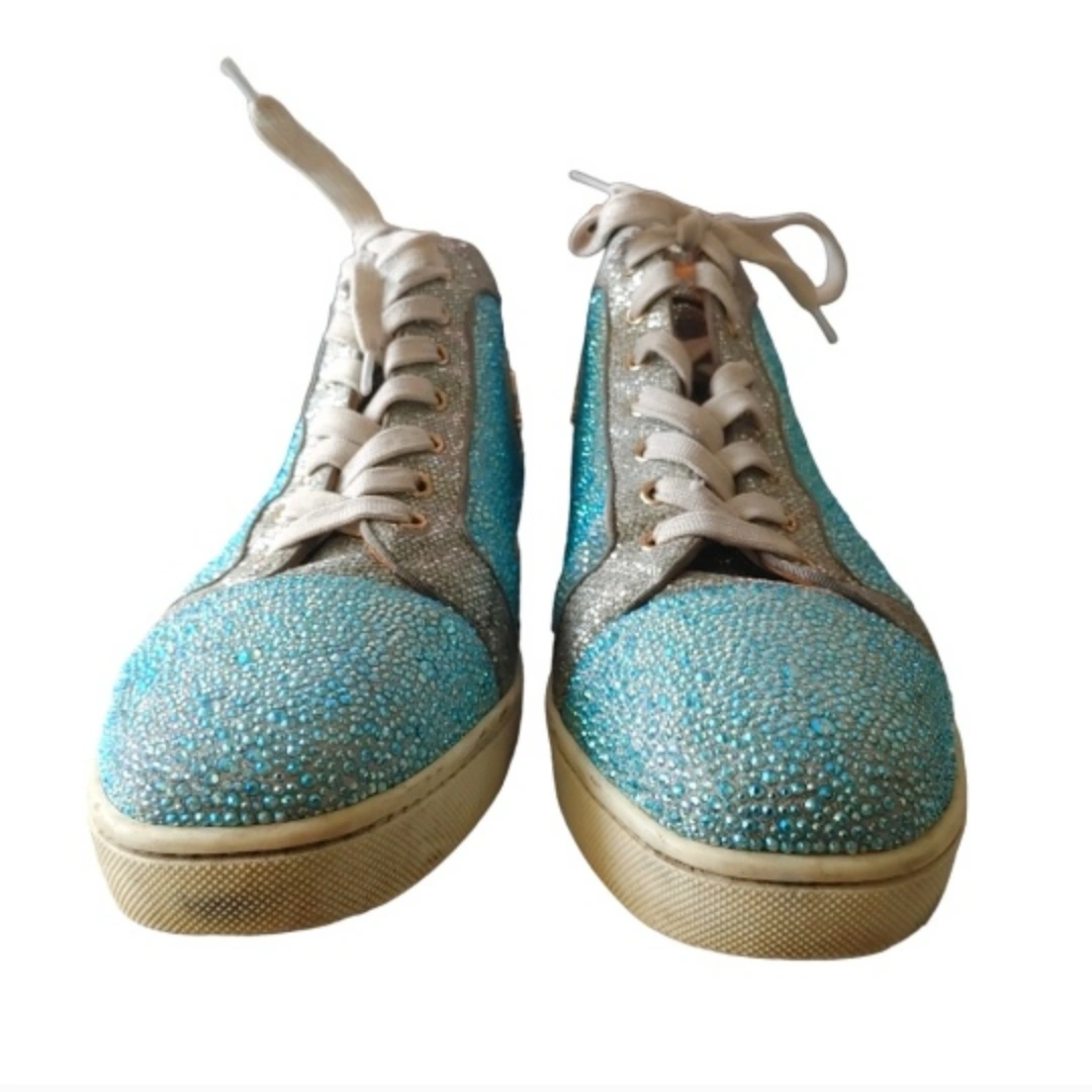 Features: The Louis Junior Strass is a core design in the Christian Louboutin sneaker edit. Simple and stylish, these round-toe sneakers are crafted to a streamlined, low-top silhouette and set off by a covering in bold strass. The set is detailed with a grosgrain piping finish. Blue and Solver Crystal embellishment throughout. They're lined in leather for a smooth, comfortable fit.