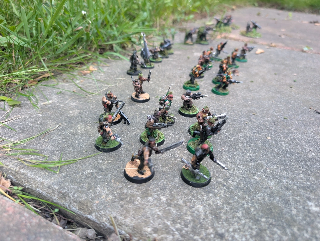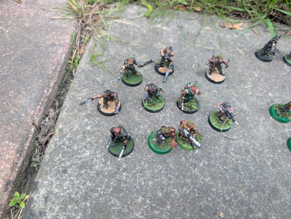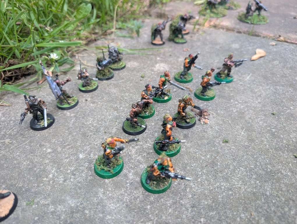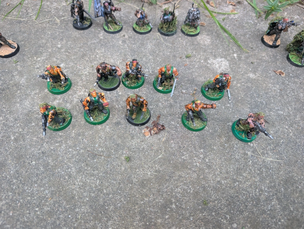 Get ready to lead the fierce Catachan Jungle Fighters with 'the fighting 647' into battle with this nicely painted Warhammer 40K army. This army includes a variety of miniatures from the Catachan regiment; which includes, a Command Squad, 20 Catachan Devils, a team of Veteran Commandos and a Heavy Weapons Mortar and rocket team. Perfect for fans of intense jungle warfare scenarios. Add these detailed miniatures to your collection and bring the rugged warriors of Catachan to life on the tabletop battlefield. Command your troops with precision and style as you immerse yourself in the rich lore and strategic gameplay of Warhammer 40K. Whether you're a seasoned player or just starting out, this Catachan Jungle Fighters army is a must-have addition to your Warhammer collection. Engage in epic battles and dominate your opponents with this unique and powerful army.