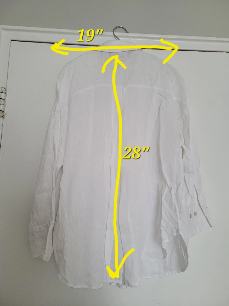 281Women's oversized linen shirt. Drop shoulder, approximate measurements in the picture White colour. Button-down closure. Relaxed fit. One chest pocket.