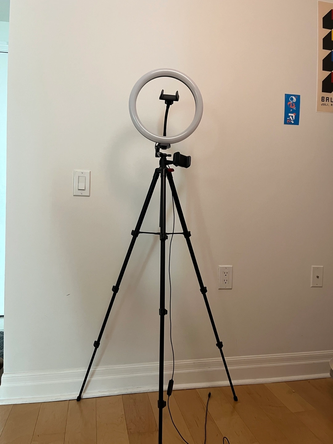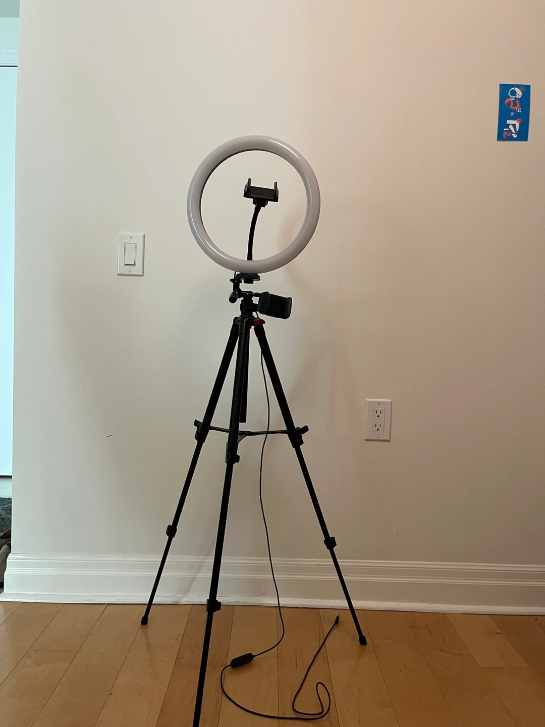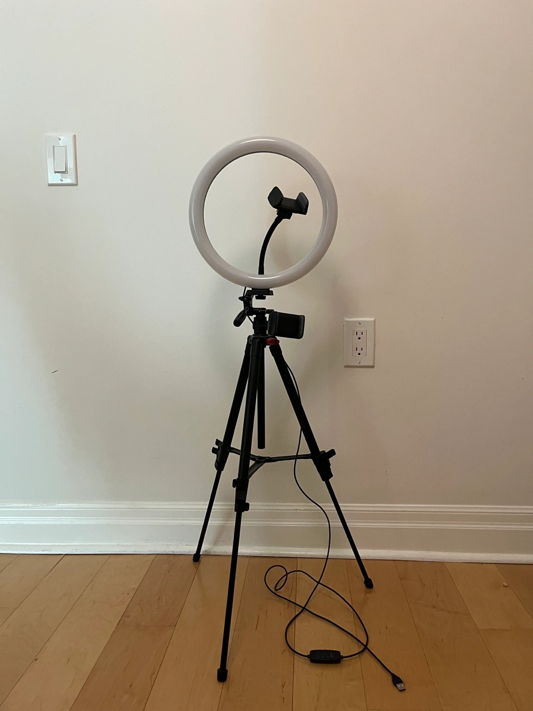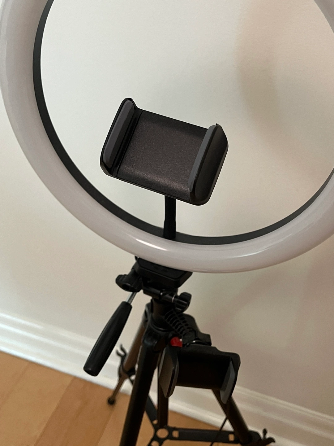 LED ring light tripod with 3 height settings (pictured), also collapsible for easy portability. The light is adjustable for brightness and warmth levels with buttons on the cord.