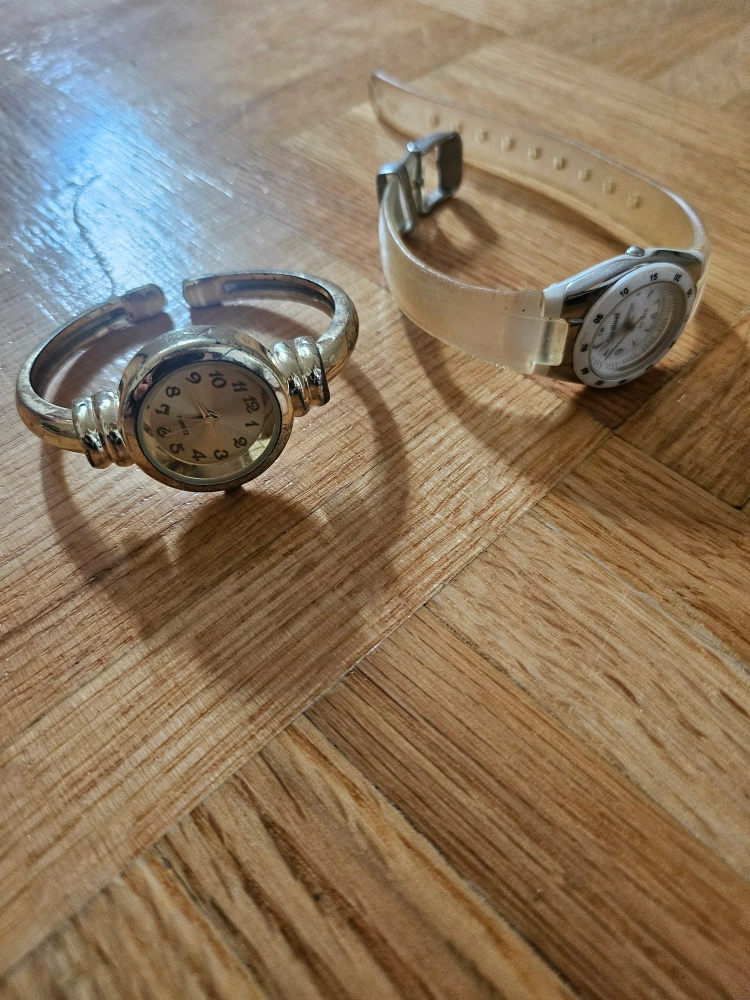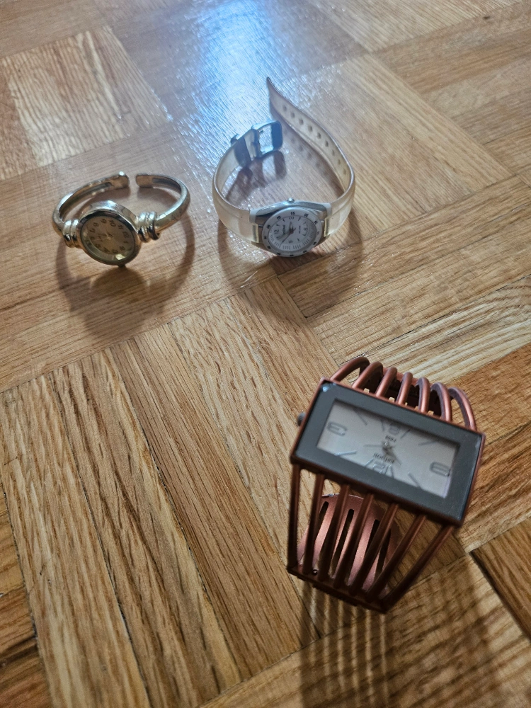 Several ladies' watches. One has a clear band ($5), another one has a metal frame design ($5). Another one is a bangle watch ($4). Watches are great to make a statement, or to just keep the time.