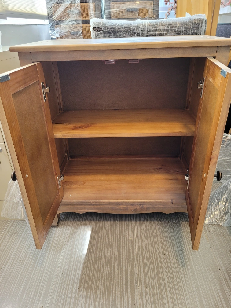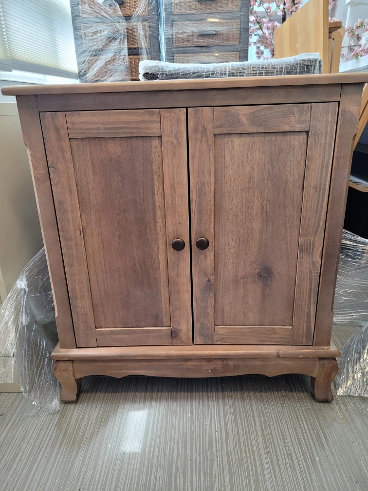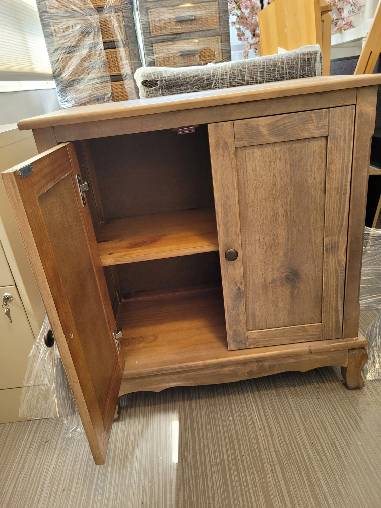 Solid wooden cabinet. Two doors and a shelf inside. Great for all your storage needs while creating a calm space. Neutral greige wood tone seemlessly compliments any decor.