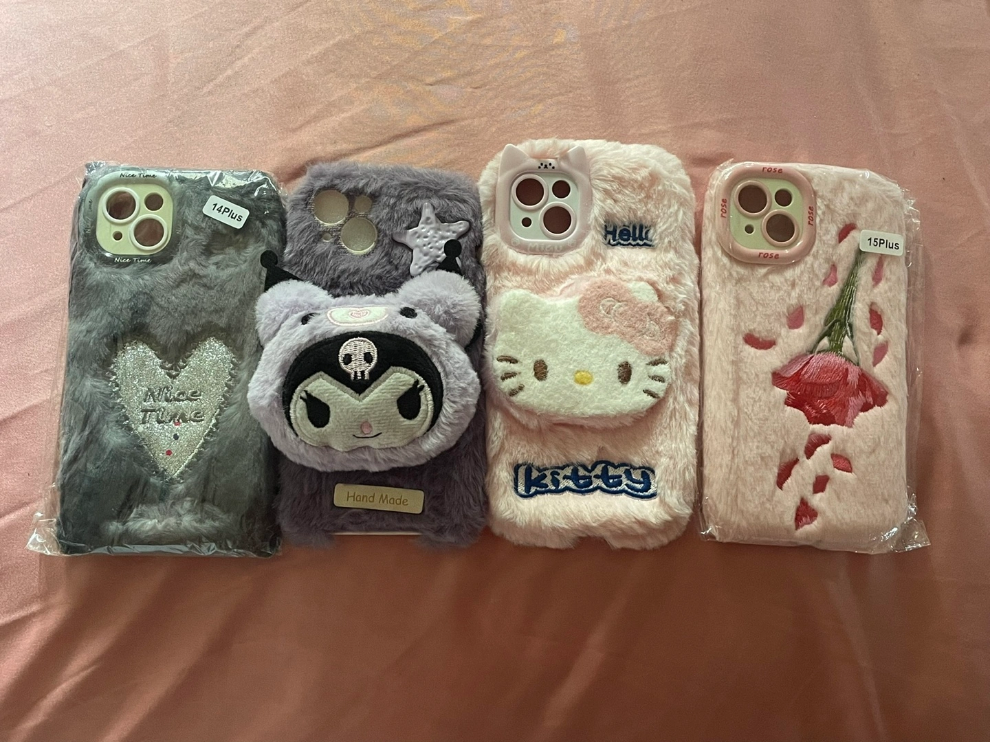 Cute phone cases covered in soft material. One case has a heart design, another features Kuromi, and there's a Hello Kitty case too, and one rose case, all designed to fit your phone perfectly. Imagine holding your phone feeling cozy and warm. (hello kitty sold)