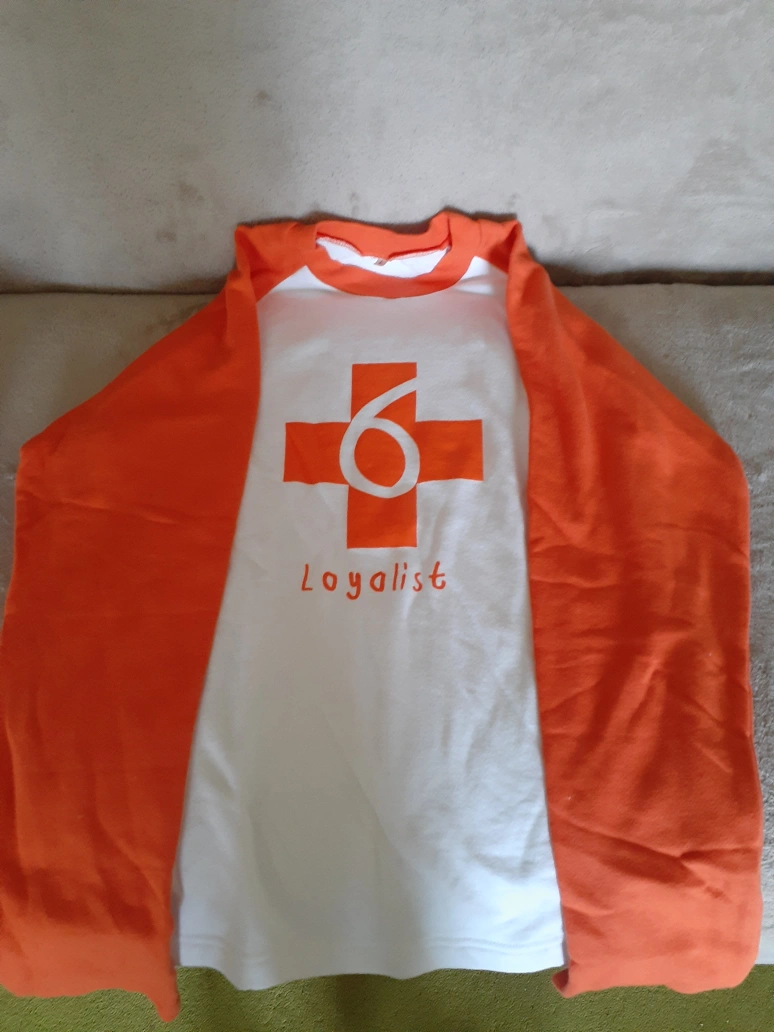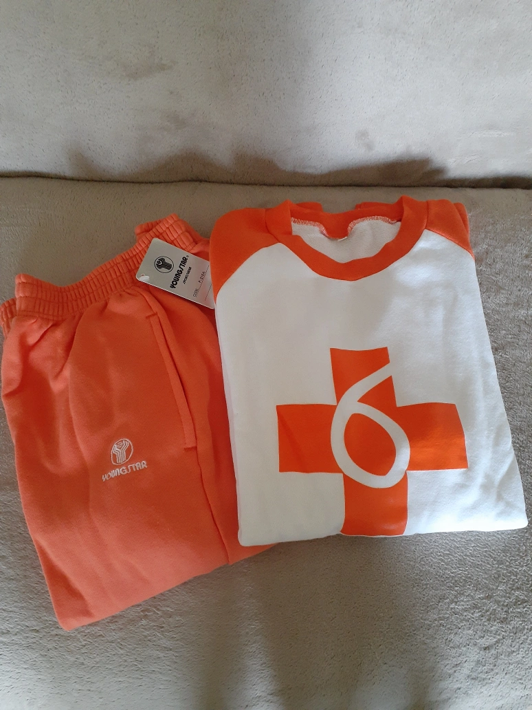 Includes a white and orange graphic sweat shirt with a number and cross. The orange pants have pockets and elastic waist. Snuggle up and feel warm.