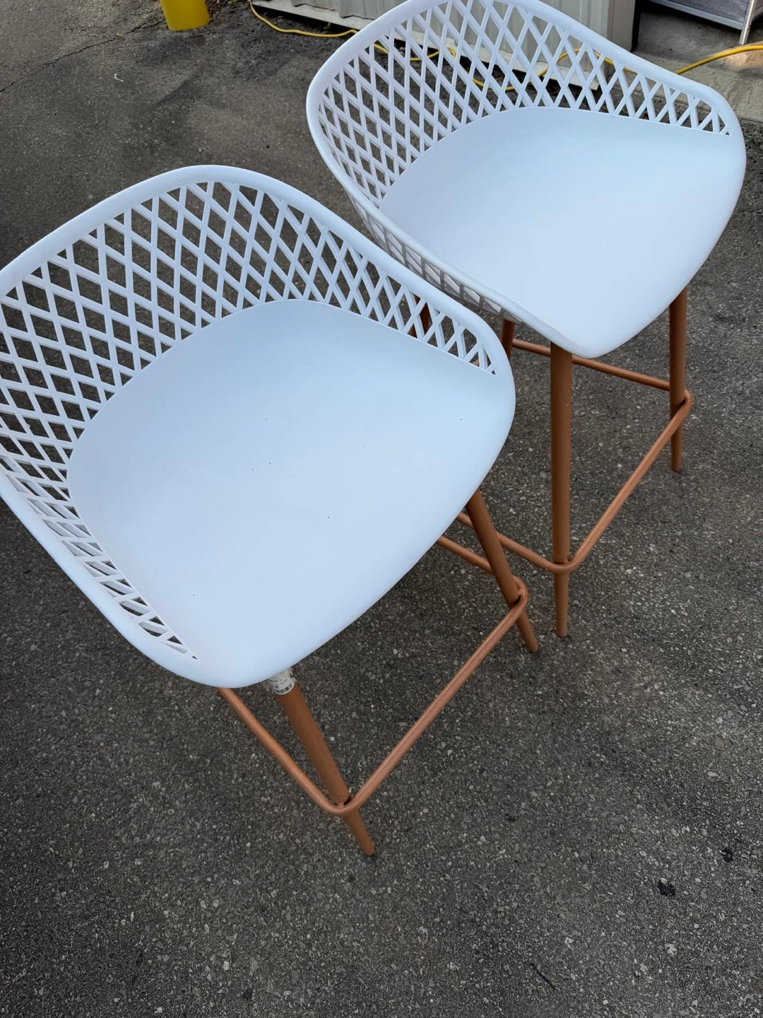 Two white bar stools with wooden legs. Features a lattice back design and a rounded seat. I think these chairs would be perfect for having a quiet moment in your kitchen.$60 each