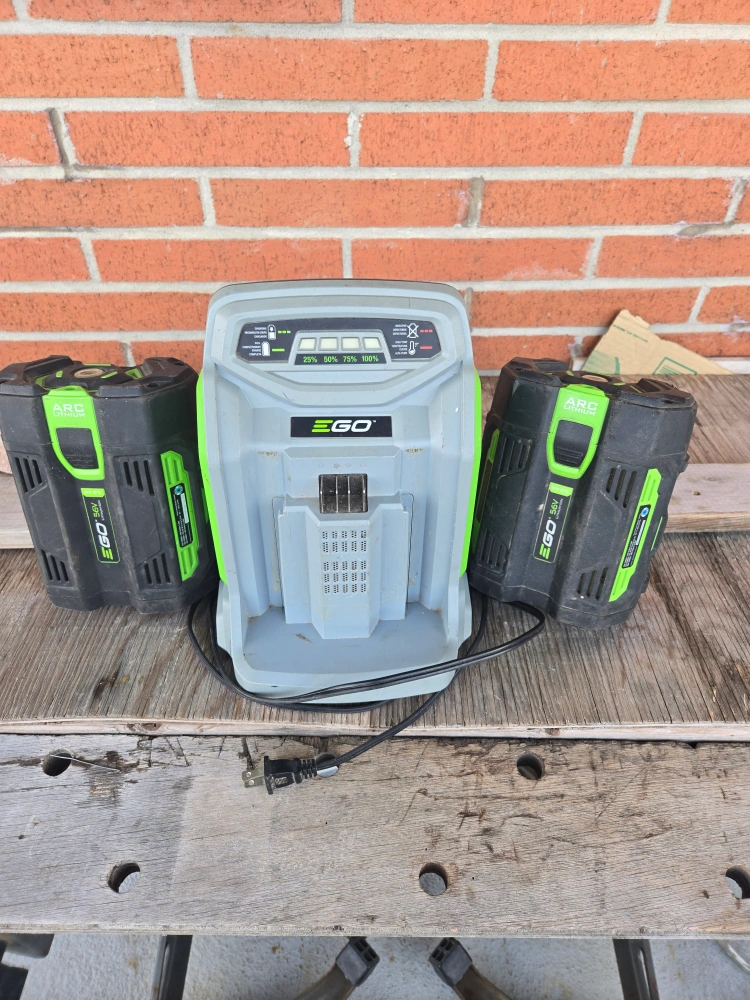 Selling an EGO battery and charger set. Charger is gray and has indicator lights. Batteries are black with green accents. A great tool to have on hand to help take care of your yard work.