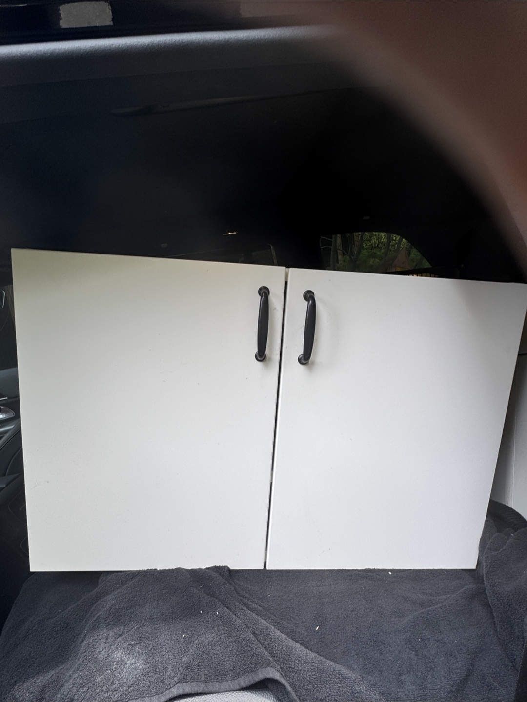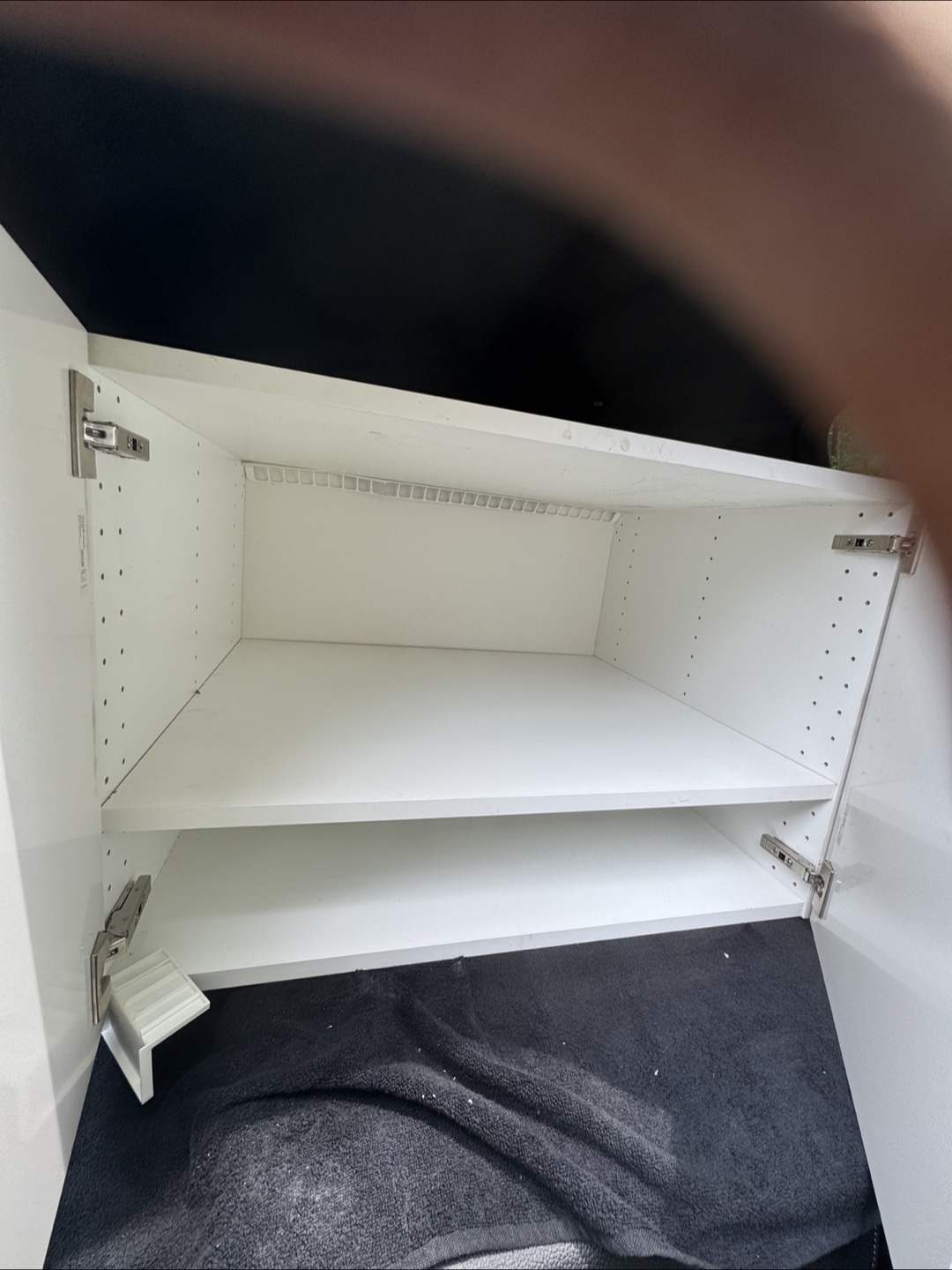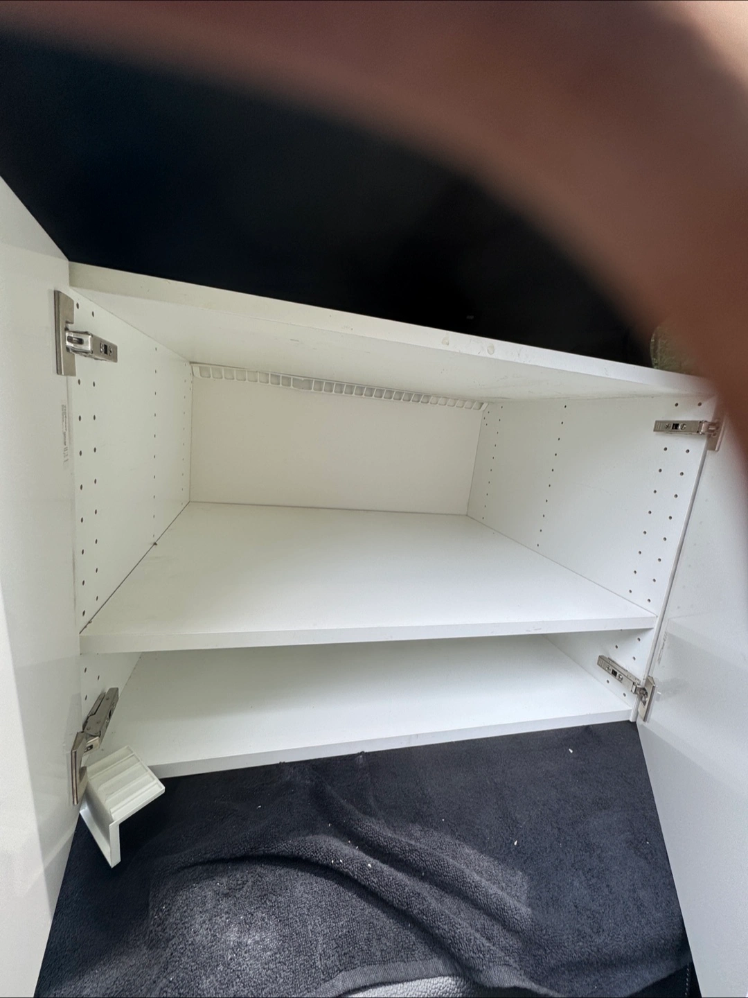 LOWER: 30"W x 40" H x 15.25" D (UNIT HAS 3 SHELVES) Two White cabinets with two doors and black handles. Inside, there are adjustable shelves. Perfect for discreet storage. You'll love using this to organize your favourite items, creating a clutter-free space.