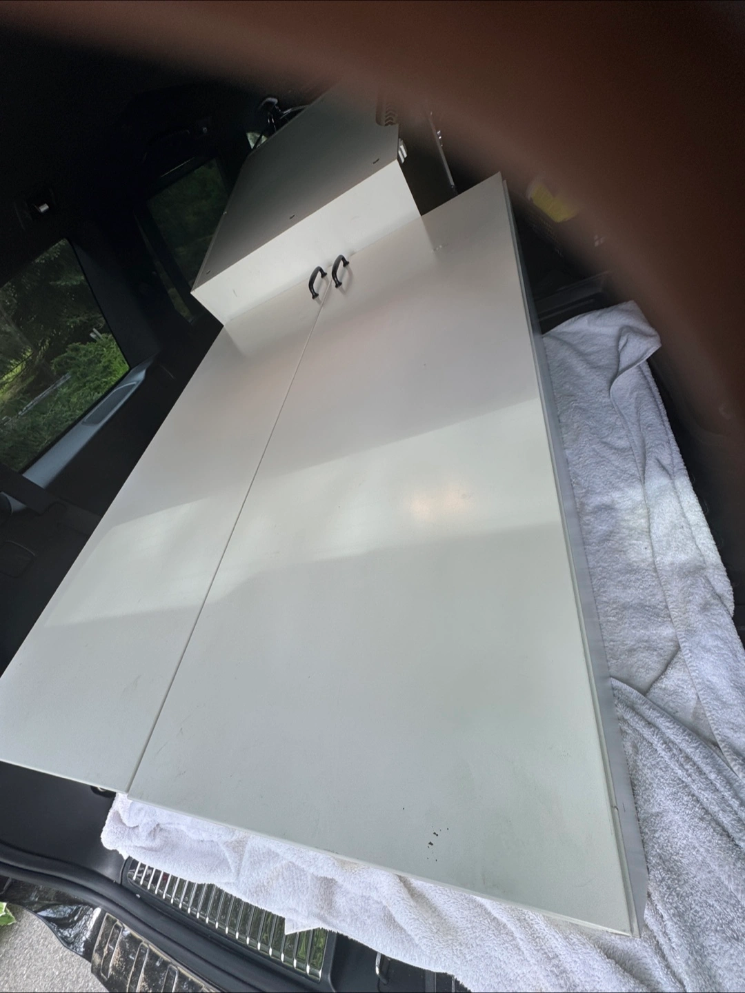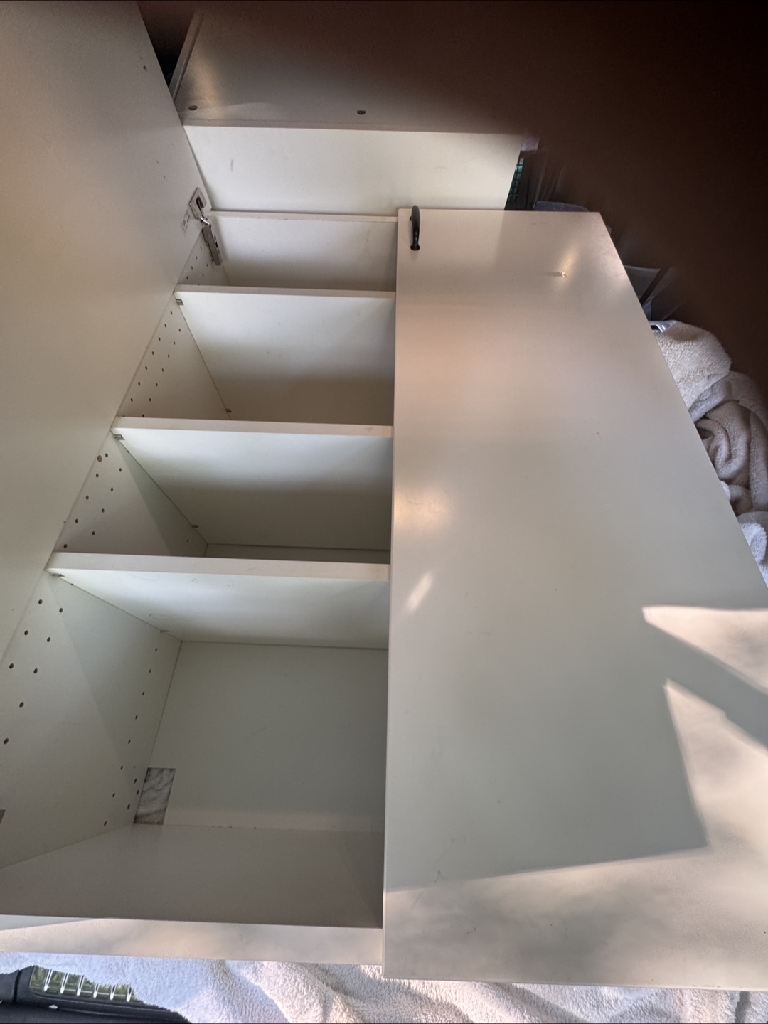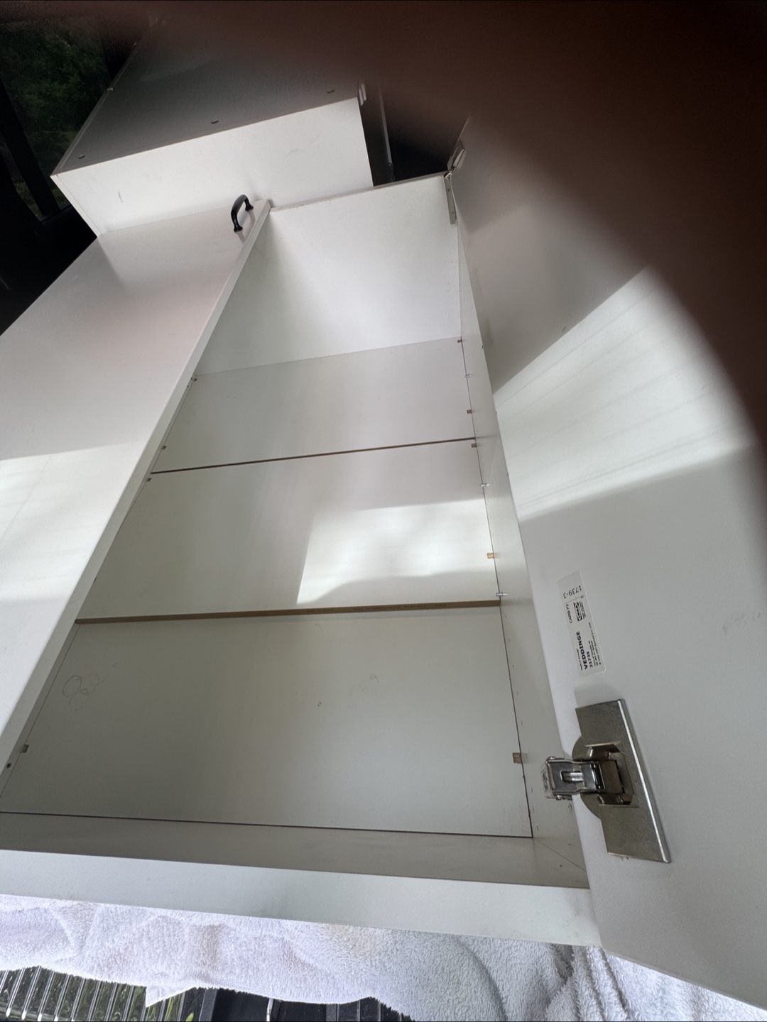 LOWER: 30"W x 40" H x 15.25" D (UNIT HAS 3 SHELVES) Two White cabinets with two doors and black handles. Inside, there are adjustable shelves. Perfect for discreet storage. You'll love using this to organize your favourite items, creating a clutter-free space.