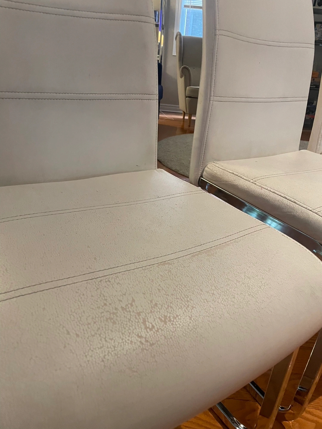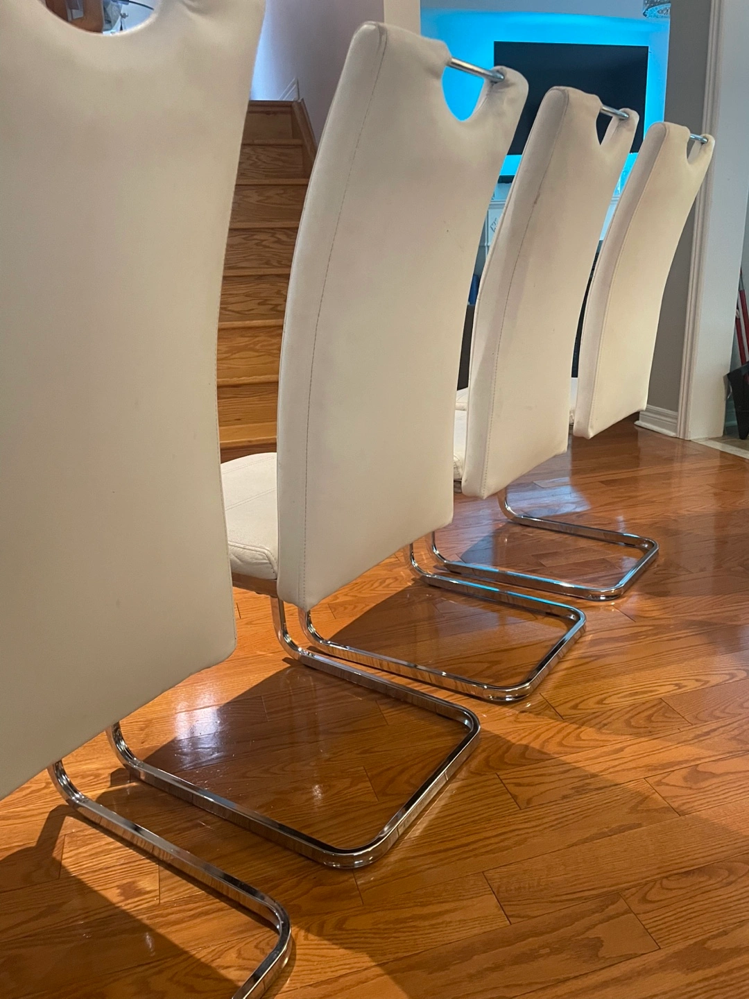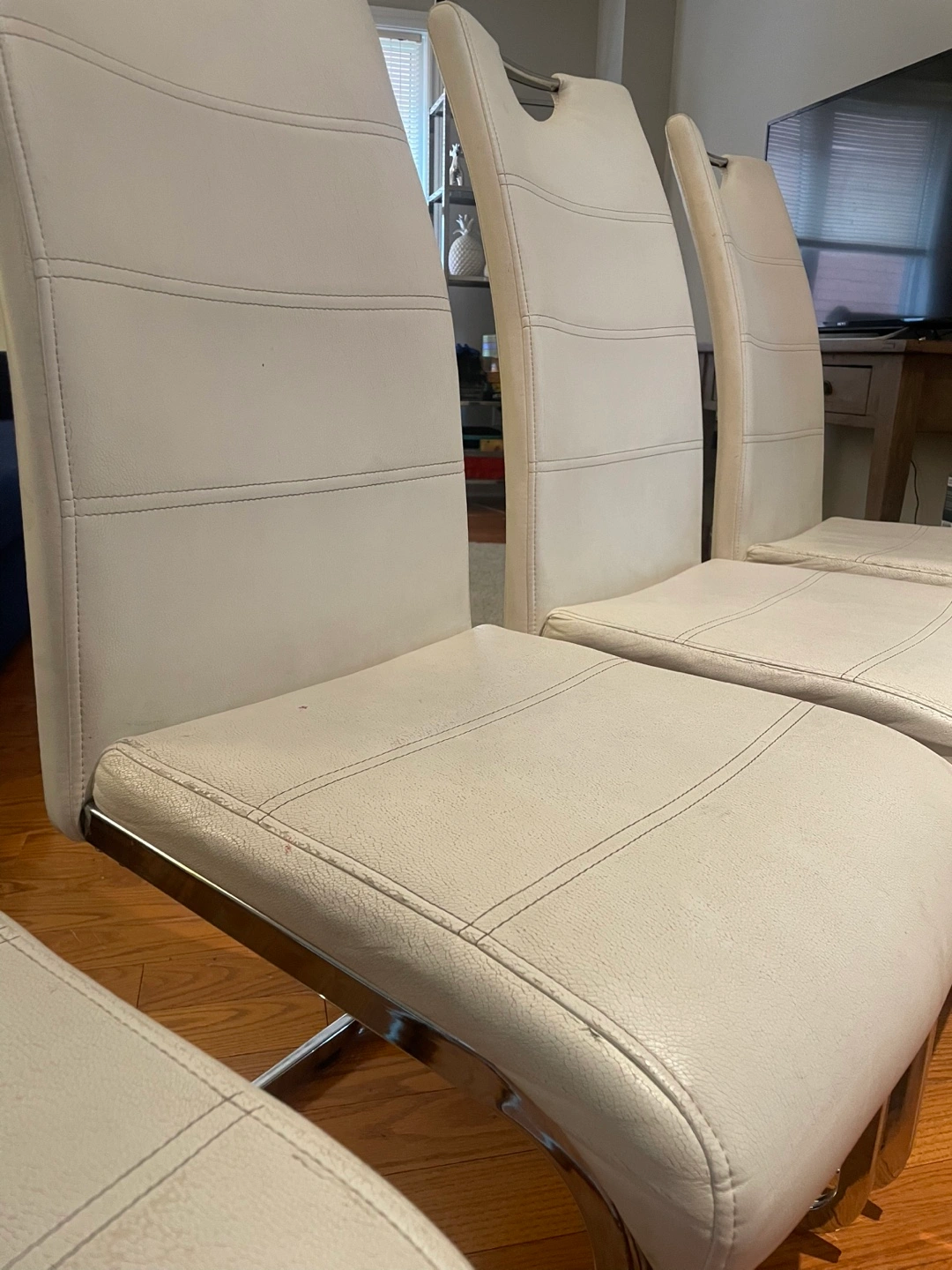 Four stylish chairs. White upholstery. Steel frame base. Stitched detailing on the back and seat. The chairs are perfect for gathering around a table. As is.